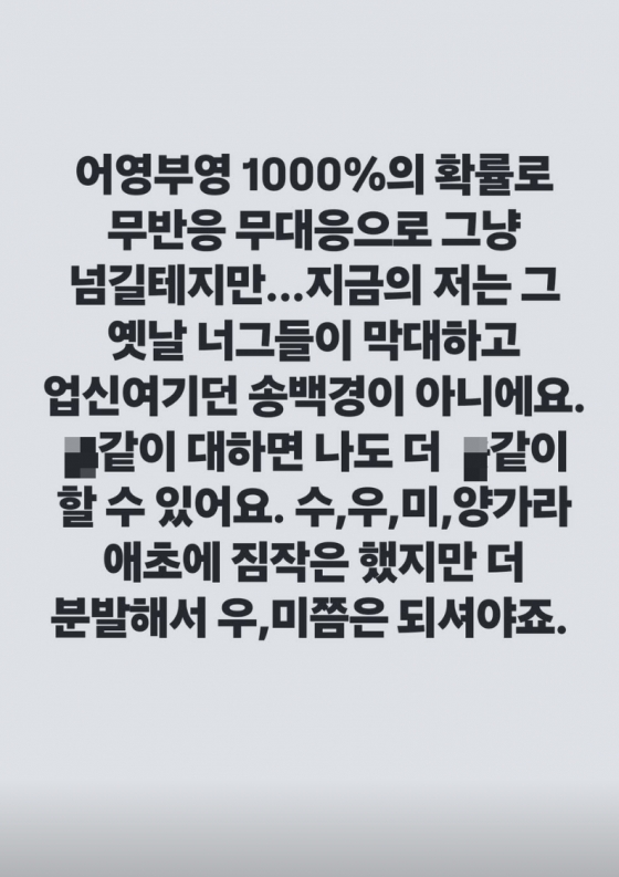 특히 송백경은 YG와 양현석을 언급, "아직도 망원동 '수우미양가'네 녹봉 먹고 닿아 있는 XX 혹시 내 인친 중에 아직 남아 있으면 나랑 친구 먼저 끊어라"며 "이미 그 쪽 관련 애들 다 블락 쳐 박고 연락처 차단도 다 했지만 내가 깜빡한 사람 있는 것 같다. 어영부영 1000%의 확률로 무반응, 무대응으로 그냥 넘길테지만 지금의 저는 그 옛날 너희들이 막대하고 업신여기던 송백경이 아니다. X같이 대하면 나도 더 X같이 할 수 있다. 수우미양가라 애초에 짐작은 했지만 더 분발해서 우, 미쯤은 돼야죠"라고도 언급했다.