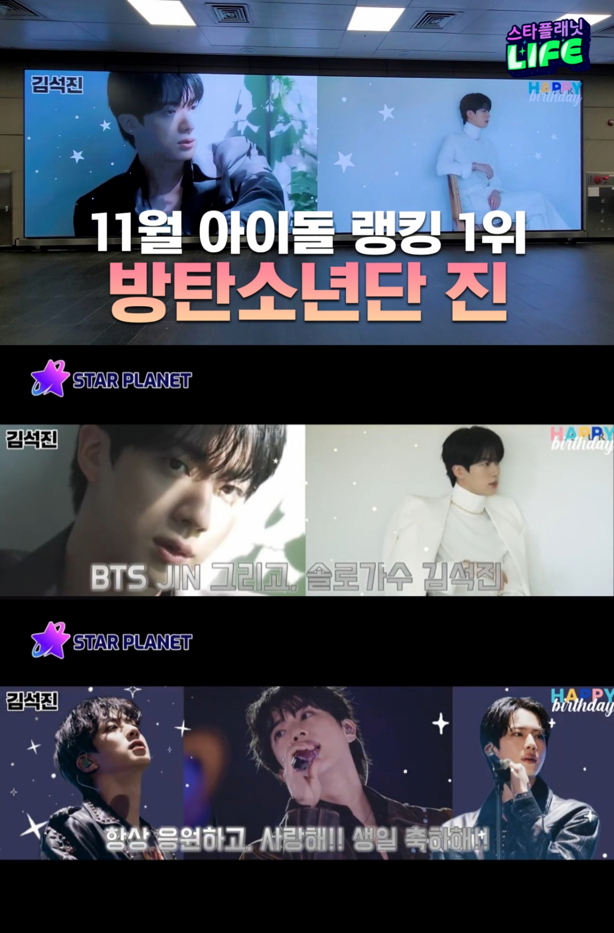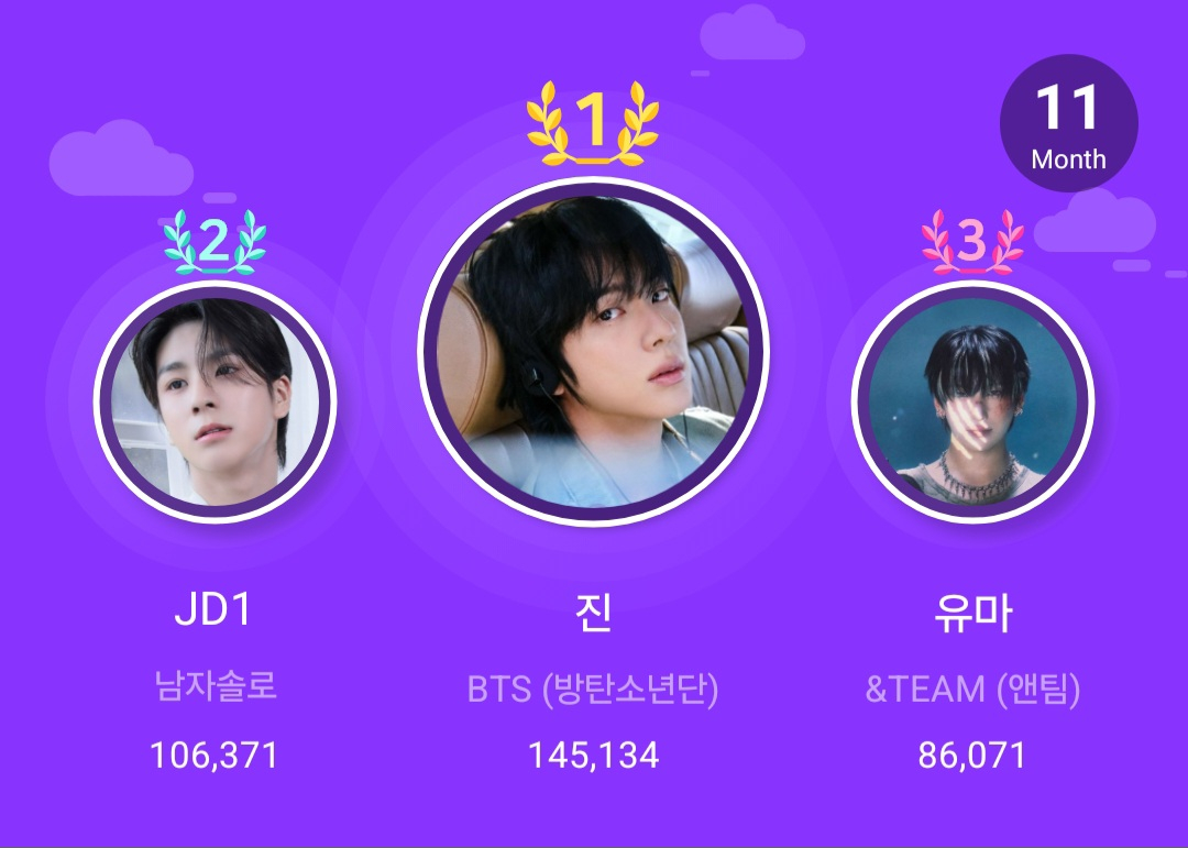 진은 지난 11월 1일부터 15일까지 글로벌 팬덤 플랫폼 스타플래닛(STAR PLANET)에서 진행된 '11월 아이돌 랭킹' 투표에서 총 14만 5134표를 얻어 1위를 차지했다. 이로써 진은 9개월 연속 1위라는 기록을 세우며 꾸준한 인기를 다시 한번 입증했다.