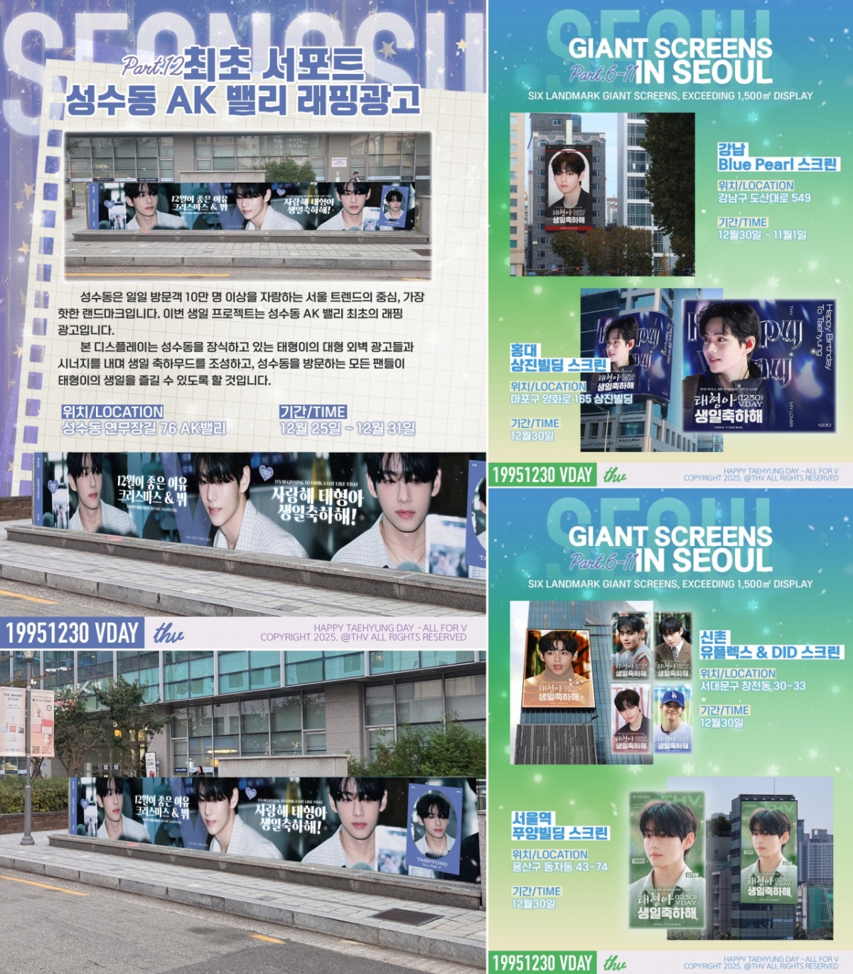 티르티르, 파라다이스시티 등 뷔의 대형 광고판이 설치돼 글로벌 팬들의 방문이 이어지고 있는 성수동에도 뷔의 생일 축하 이벤트가 열린다. 다양한 브랜드의 팝업이 열리는 장소로 유명한 성수 AK 밸리에서는 최초로 생일 래핑광고가 진행된다. 뷔바는 성수동의 대형 외벽 광고판에 설치된 뷔의 브랜드 광고와 함께 즐기기를 바란다고 전했다.