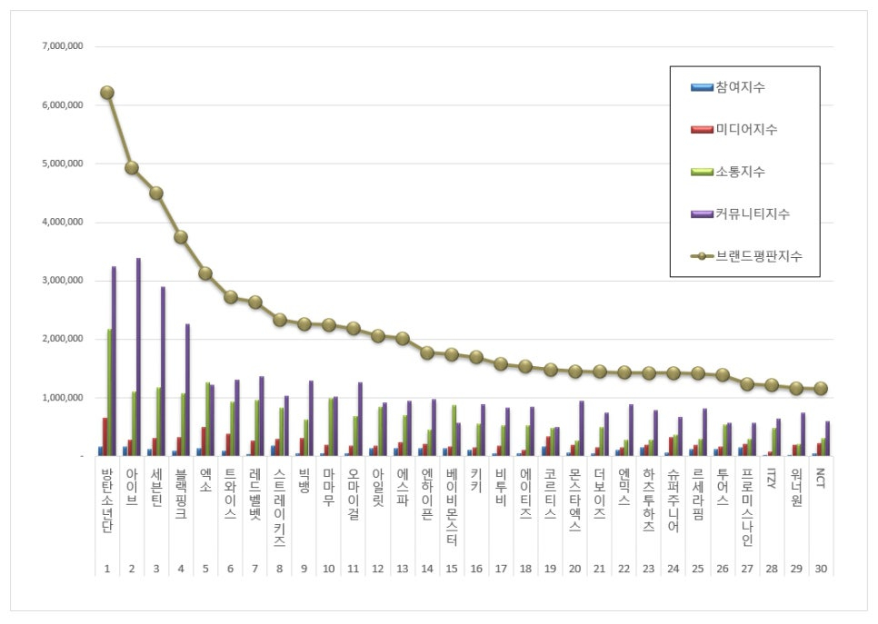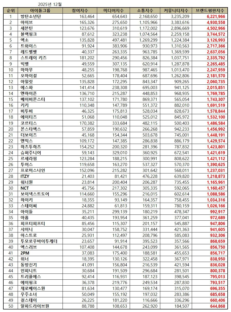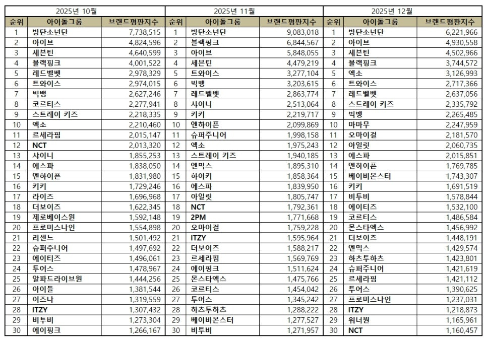2025년 12월 아이돌그룹 브랜드평판 30위 순위는 방탄소년단, 아이브, 세븐틴, 블랙핑크, 엑소, 트와이스, 레드벨벳, 스트레이 키즈, 빅뱅, 마마무, 오마이걸, 아일릿, 에스파, 엔하이픈, 베이비몬스터, 키키, 비투비, 에이티즈, 코르티스, 몬스타엑스, 더보이즈, 엔믹스, 하츠투하츠, 슈퍼주니어, 르세라핌, 투어스, 프로미스나인, ITZY, 워너원, NCT 순으로 분석됐다.