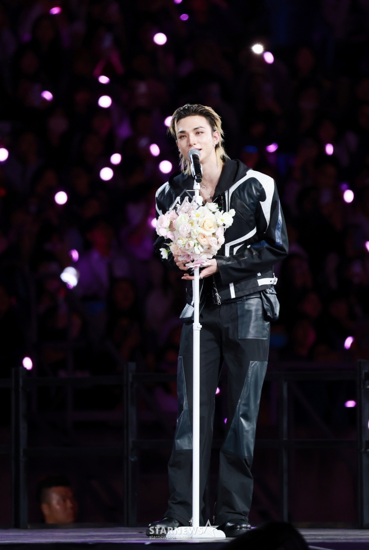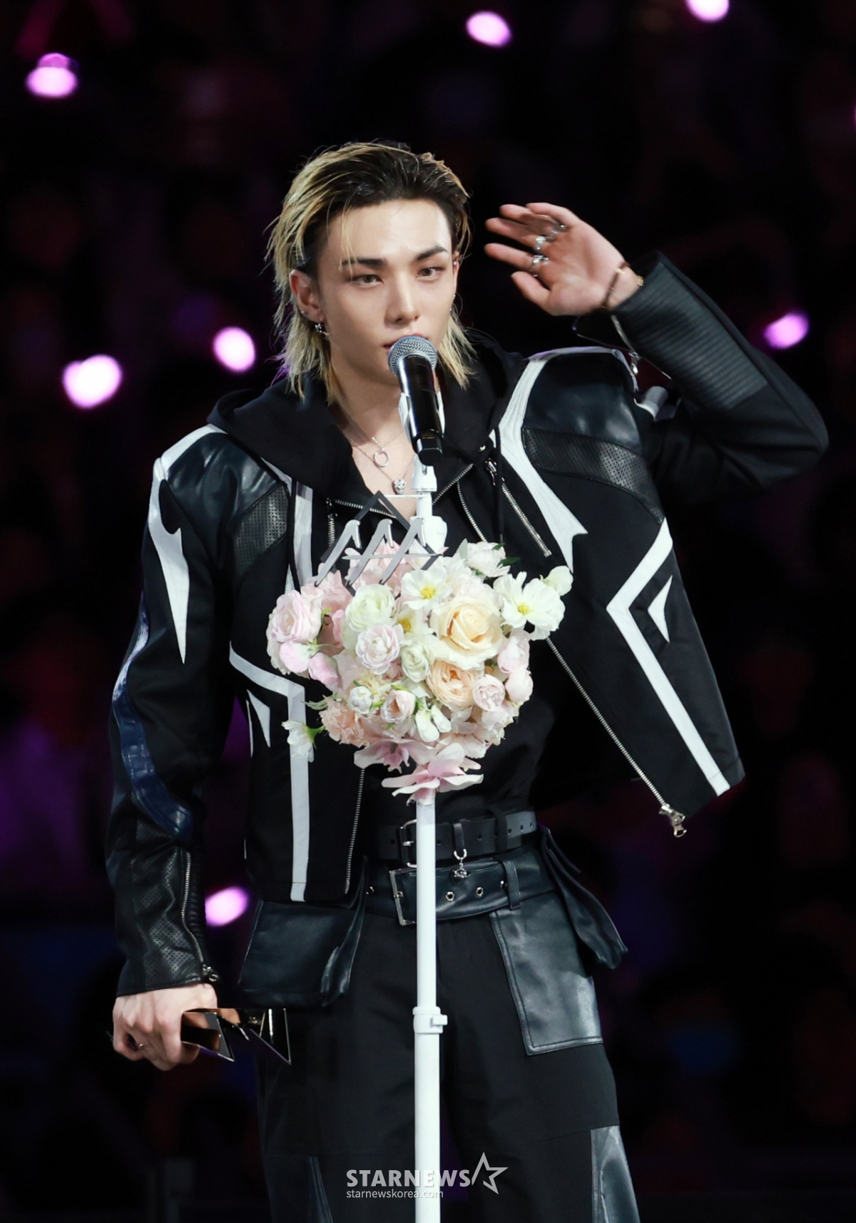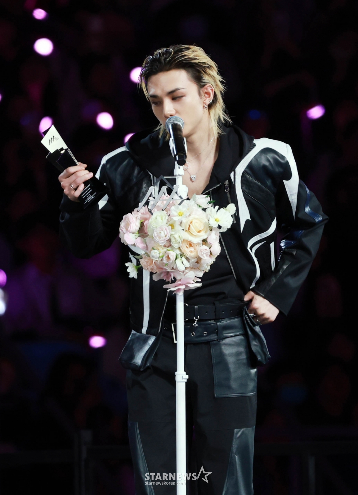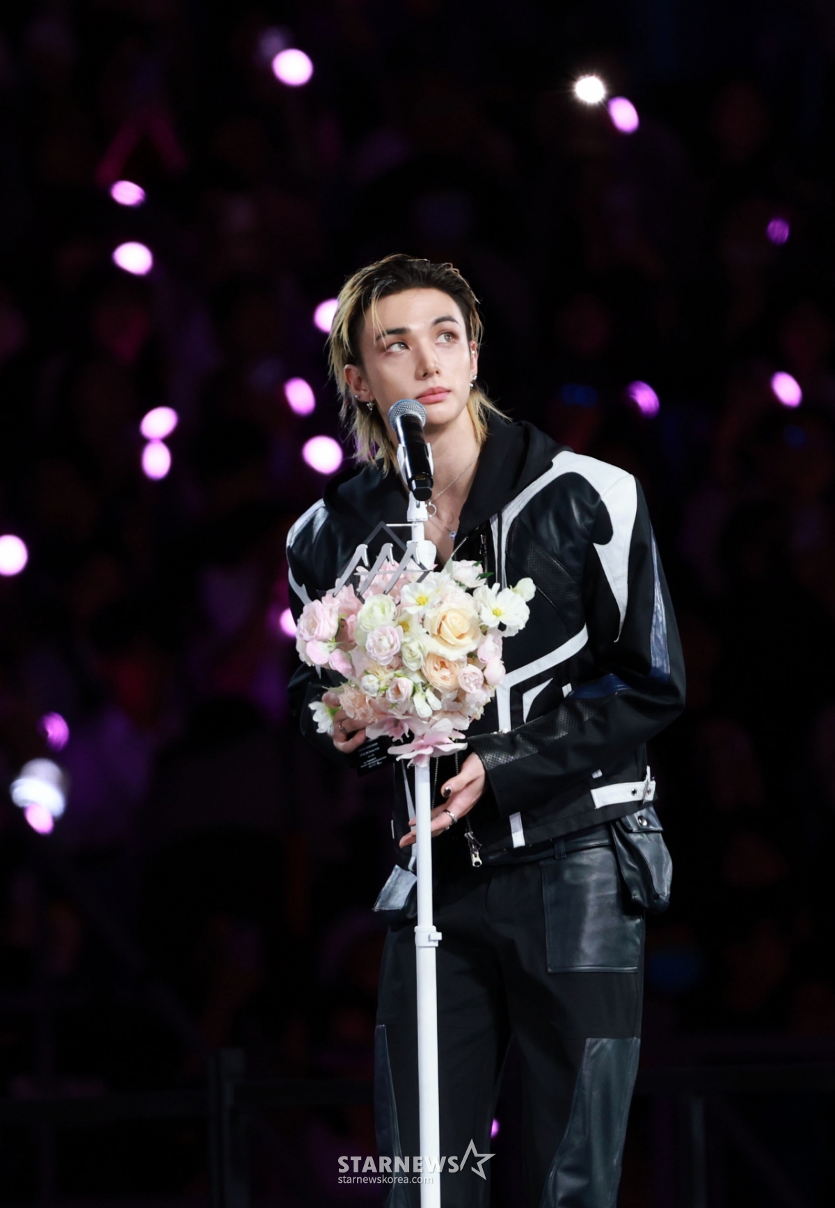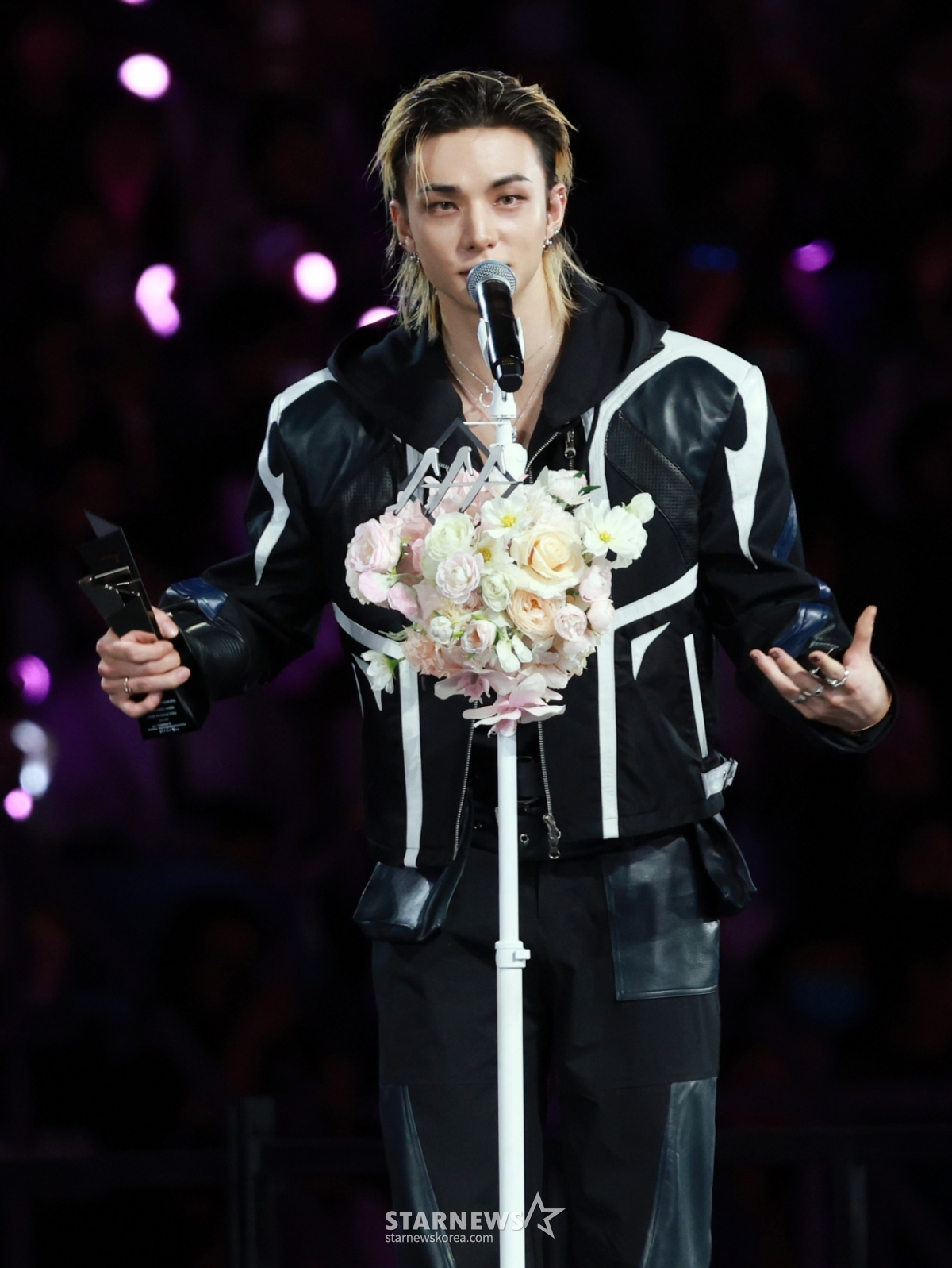 그룹 스트레이키즈 현진이 6일 대만 가오슝 내셔널 스타디움에서 진행된 스타뉴스 주최 '10주년 아시아 아티스트 어워즈 2025(10th Anniversary Asia Artist Awards 2025, '10주년 AAA 2025')에서 AAA Best Choice상을 받고 수상소감을 말하고 있다.