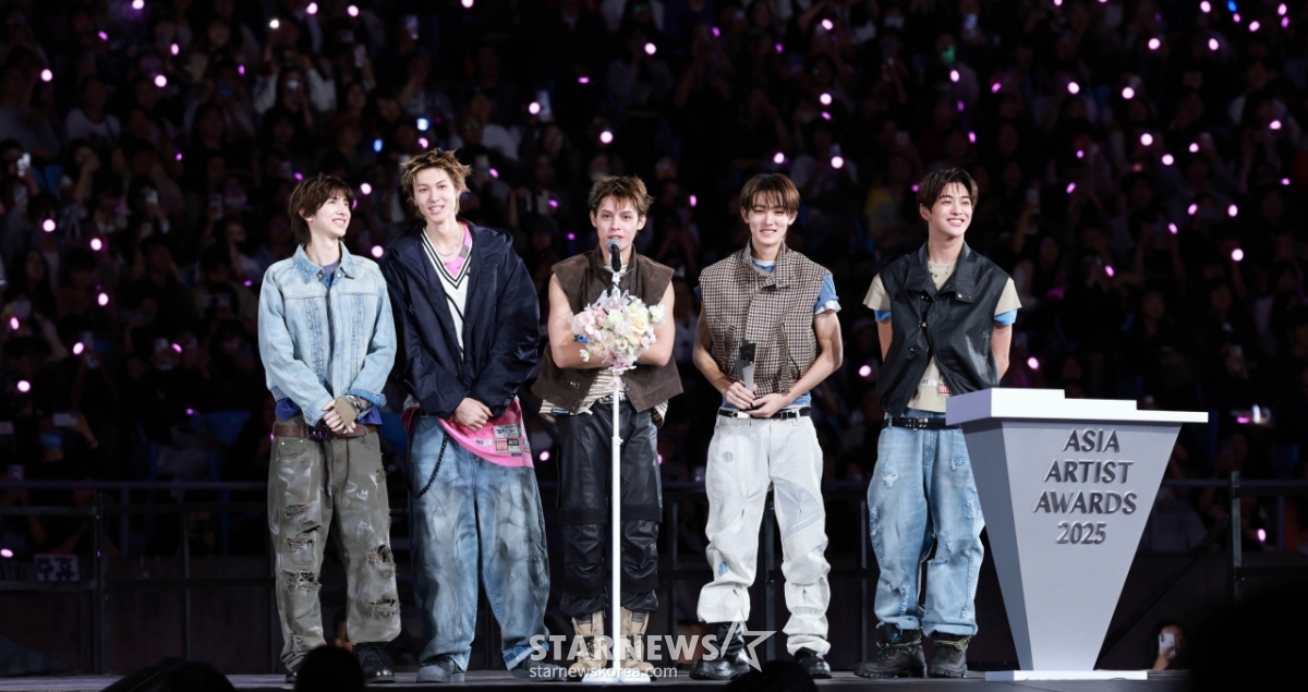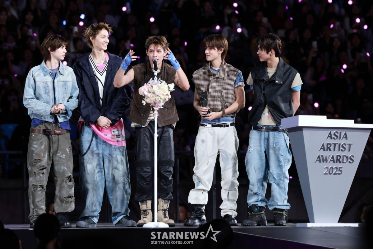 그룹 코르티스가 6일 대만 가오슝 내셔널 스타디움에서 진행된 스타뉴스 주최 '10주년 아시아 아티스트 어워즈 2025(10th Anniversary Asia Artist Awards 2025, '10주년 AAA 2025')에서 AAA Best Performance상을 받고 수상소감을 말하고 있다.