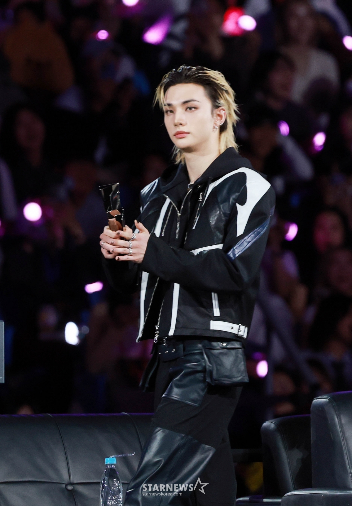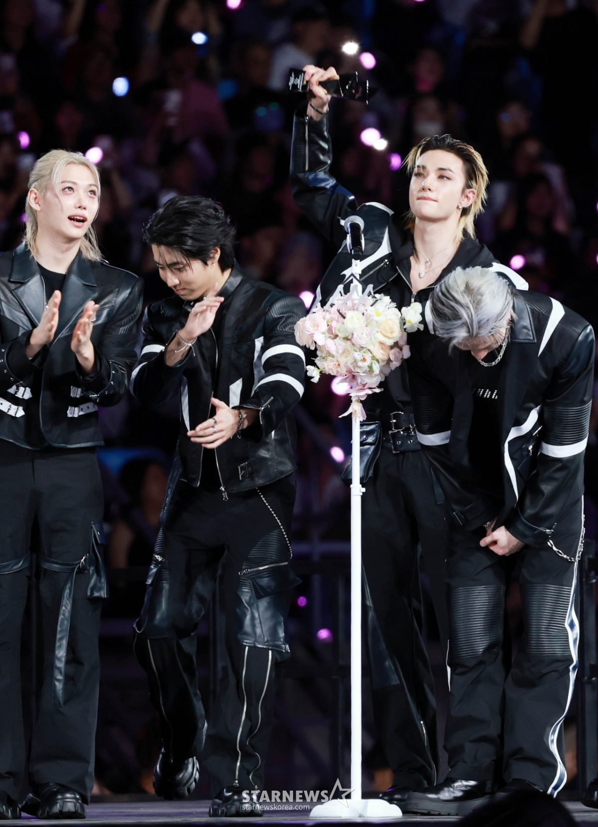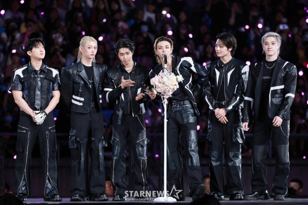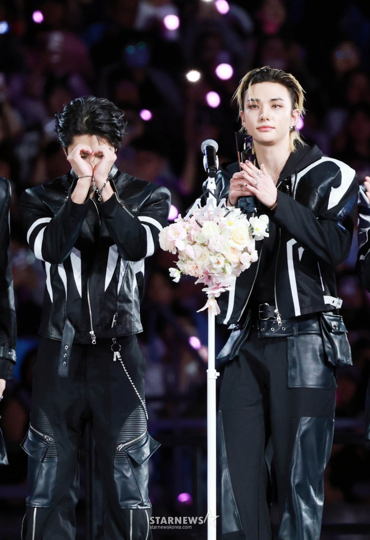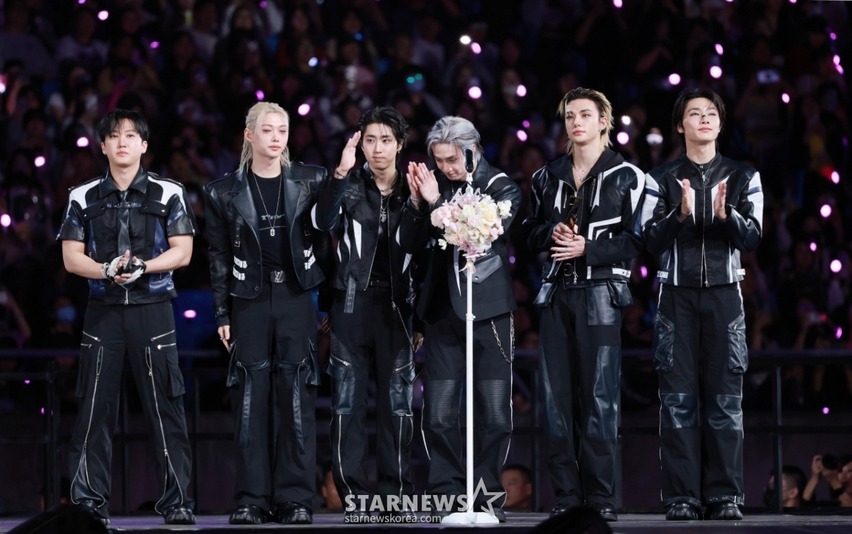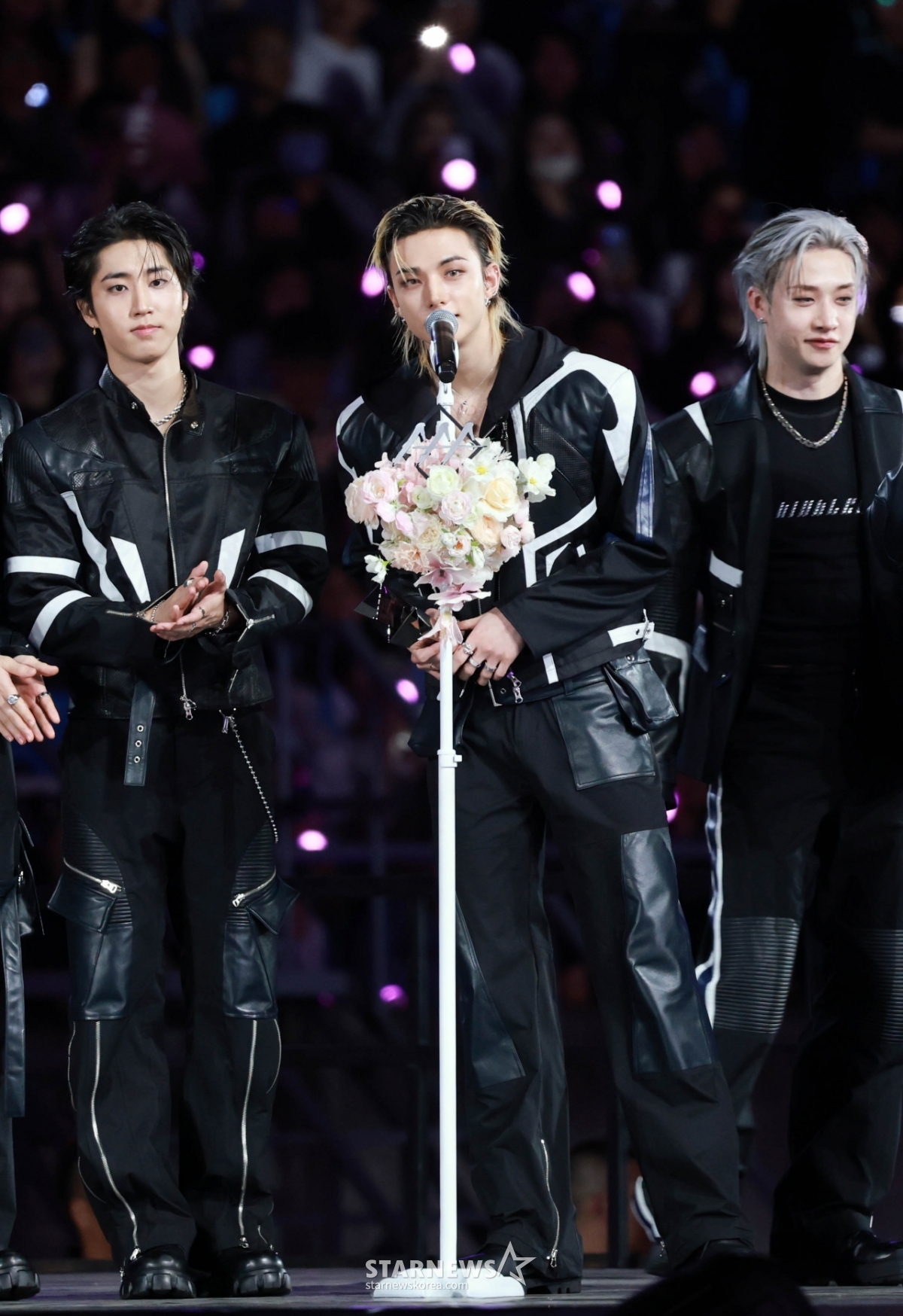 그룹 스트레이키즈(Stray Kids)가 6일 대만 가오슝 내셔널 스타디움에서 진행된 스타뉴스 주최 '10주년 아시아 아티스트 어워즈 2025(10th Anniversary Asia Artist Awards 2025, '10주년 AAA 2025')에서 AAA Best Artist상을 받고 수상소감을 말하고 있다.