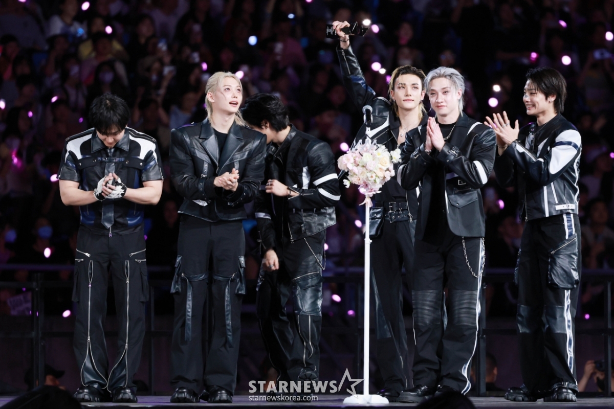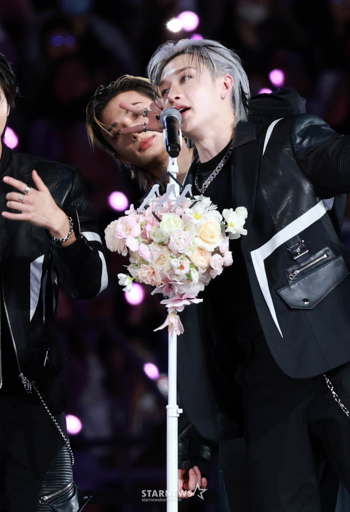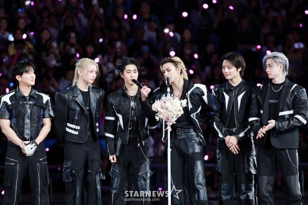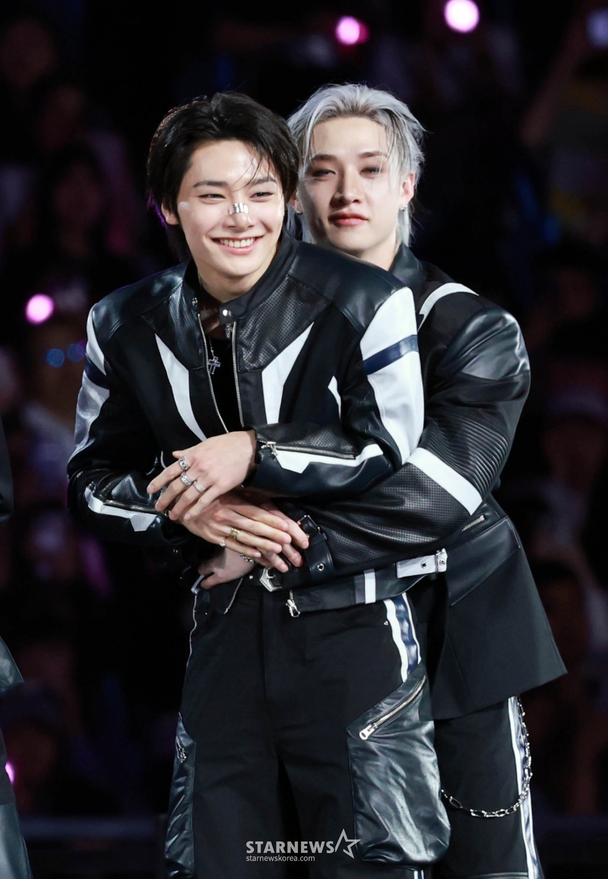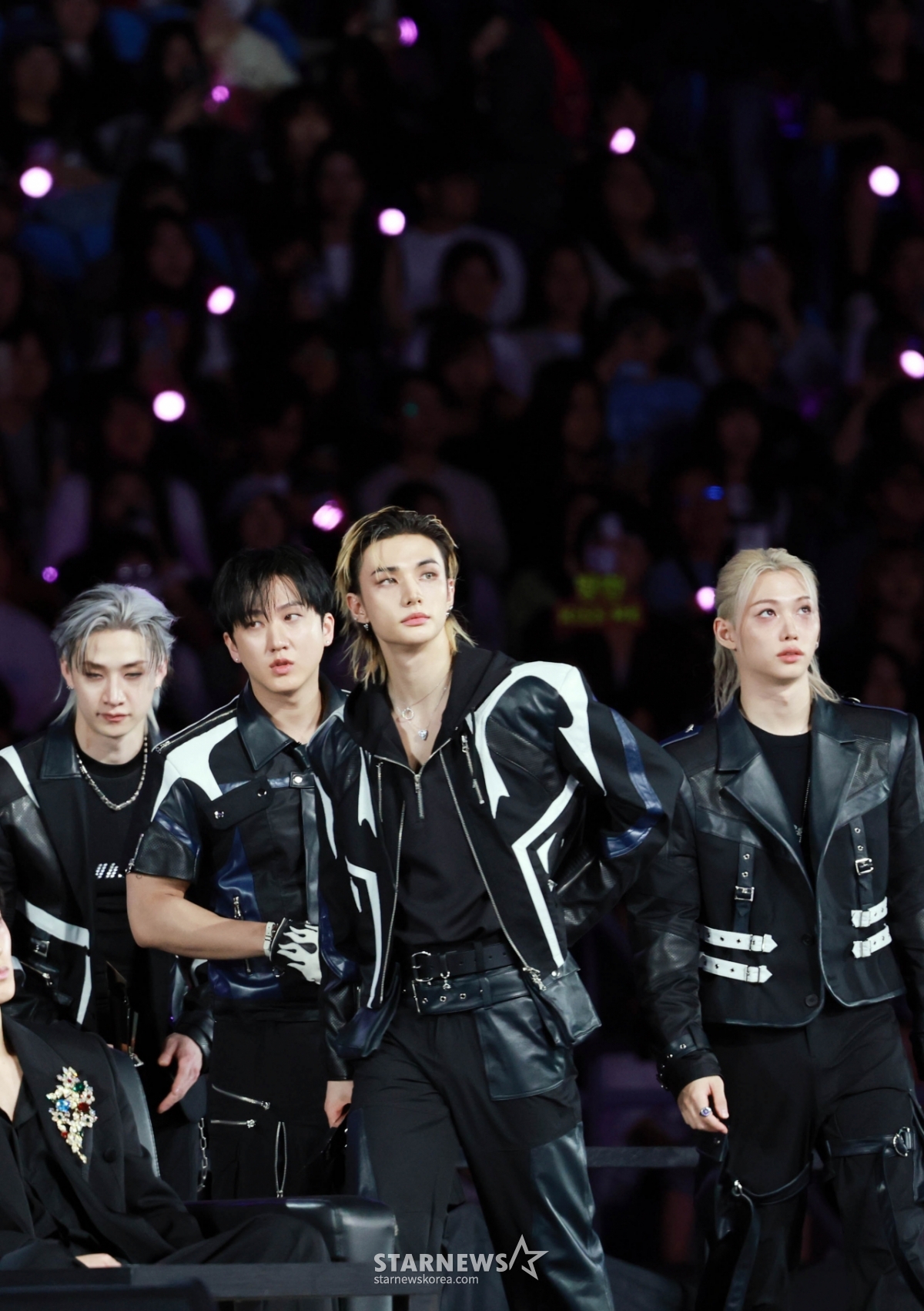 그룹 스트레이키즈(Stray Kids)가 6일 대만 가오슝 내셔널 스타디움에서 진행된 스타뉴스 주최 '10주년 아시아 아티스트 어워즈 2025(10th Anniversary Asia Artist Awards 2025, '10주년 AAA 2025')에서 AAA Best Artist상을 받고 수상소감을 말하고 있다.