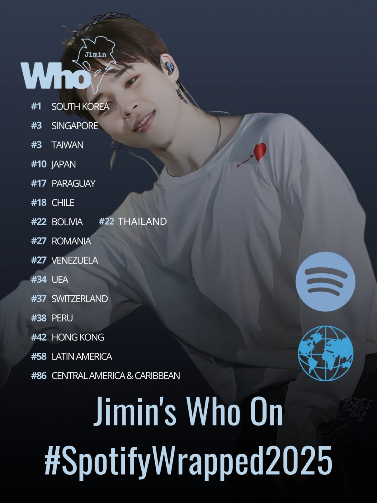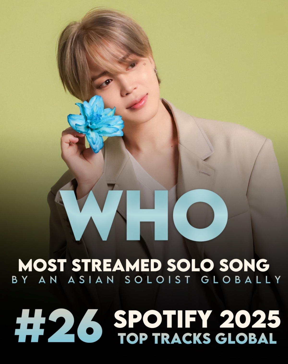 지난 3일 세계 최대 음원 스트리밍 플랫폼 스포티파이가 발표한 '2025 랩드(Wrapped) 연말 결산' 캠페인에 따르면, 지민의 2집 'MUSE'(뮤즈) 타이틀곡 'Who'(후)가 [Top Tracks of 2025 Global] 리스트 26번째에 이름을 올렸다.