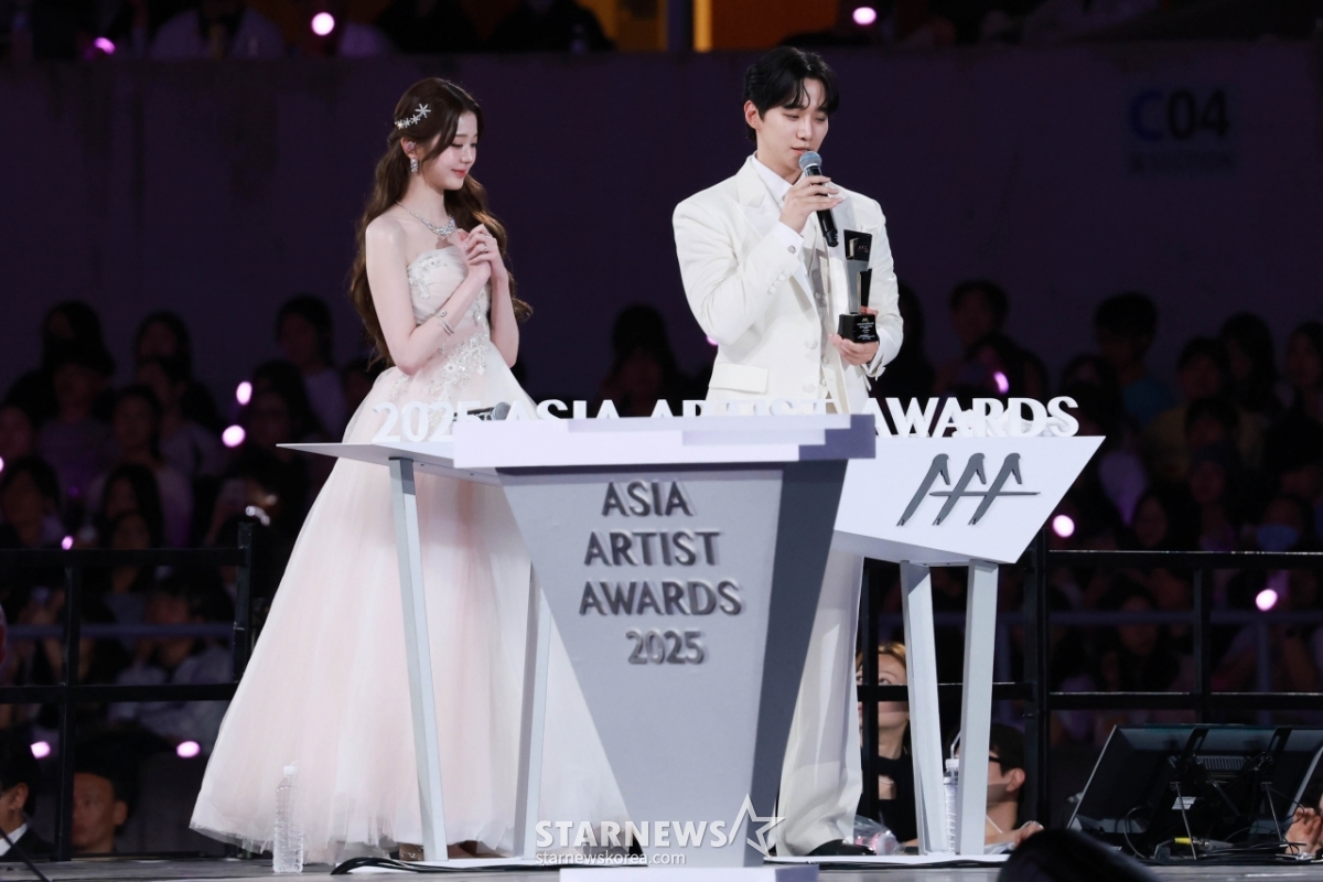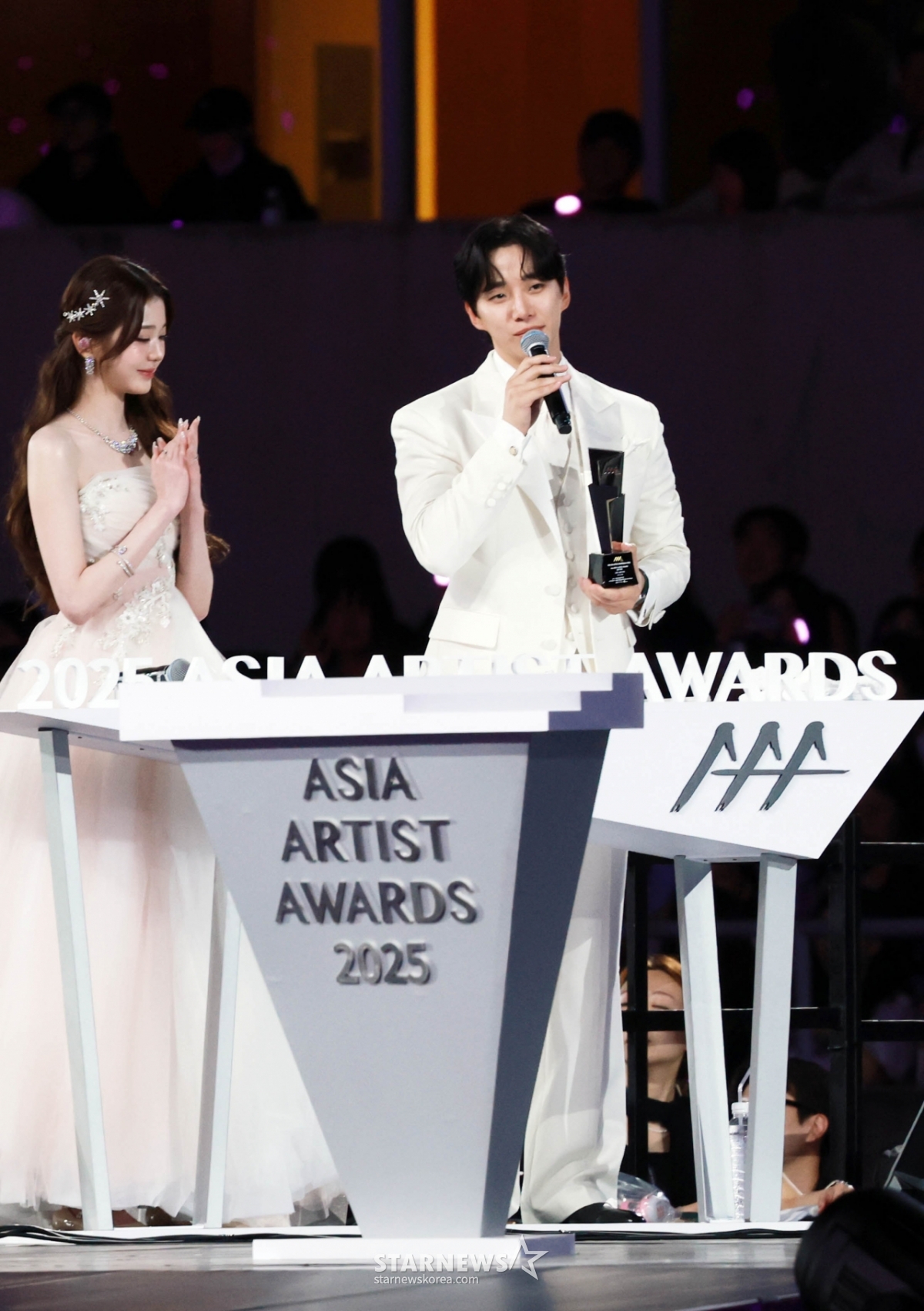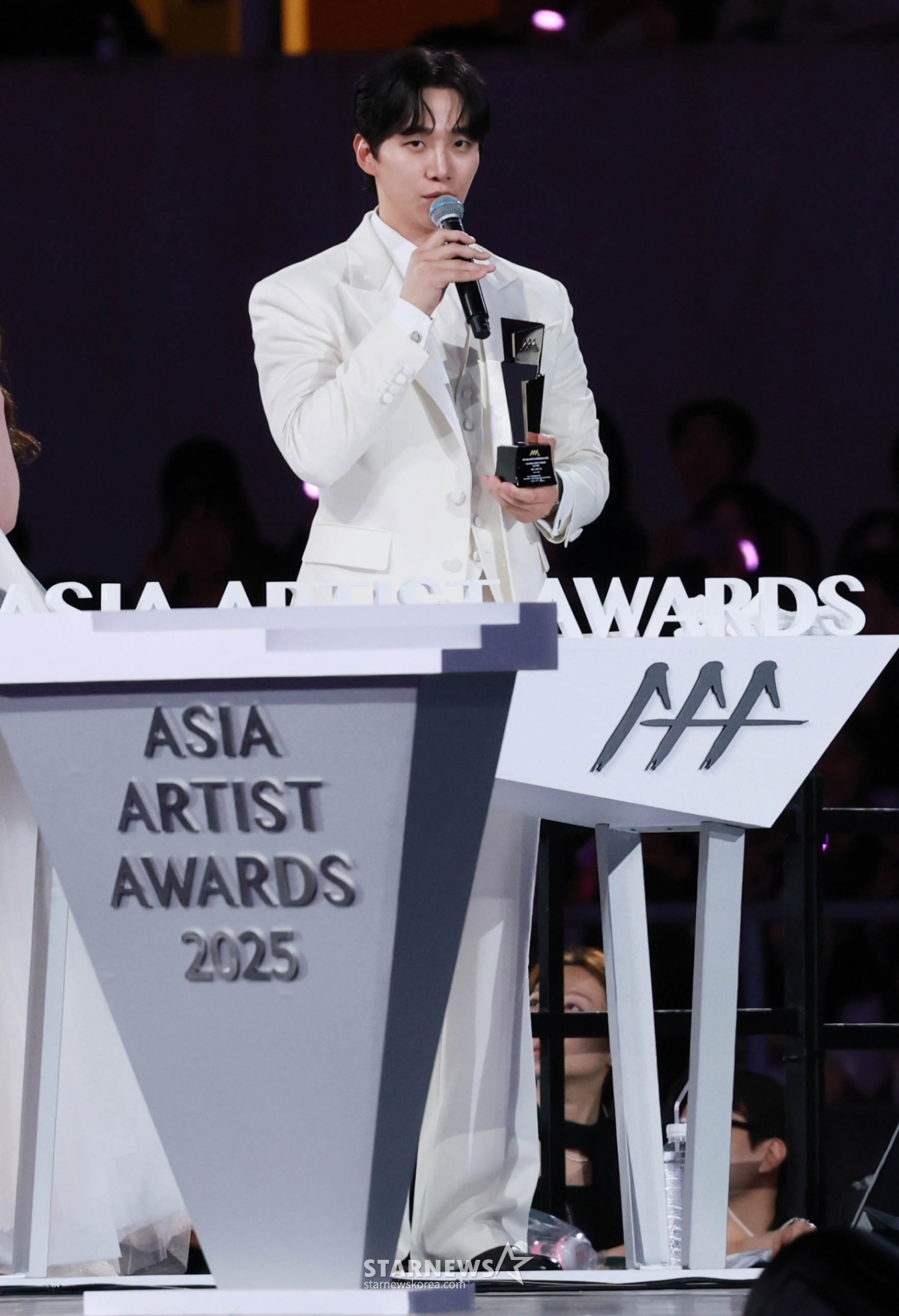 배우 이준호가 6일 가오슝 내셔널 스타디움에서 진행된 스타뉴스 주최 '10주년 아시아 아티스트 어워즈 2025(10th Anniversary Asia Artist Awards 2025, '10주년 AAA 2025')에서 AAA Best Artist 상을 받고 수상소감을 말하고 있다.
