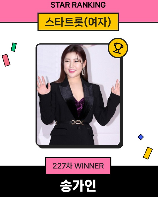 송가인은 지난 11일 오후 3시 1분부터 18일 오후 3시까지 진행된 227차 스타랭킹 스타트롯 여자 부문에서 9만3649표를 얻고 1위를 기록했다.