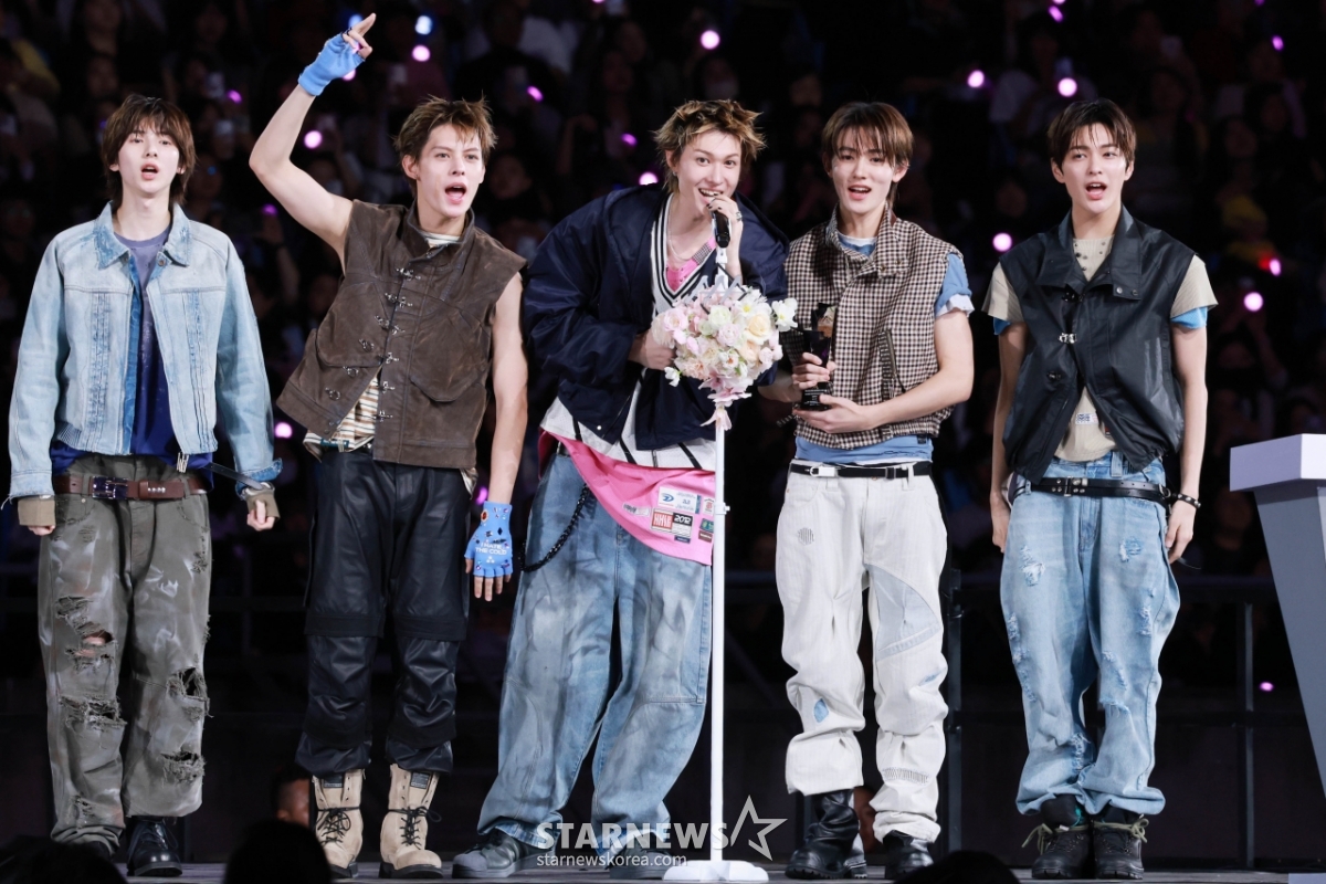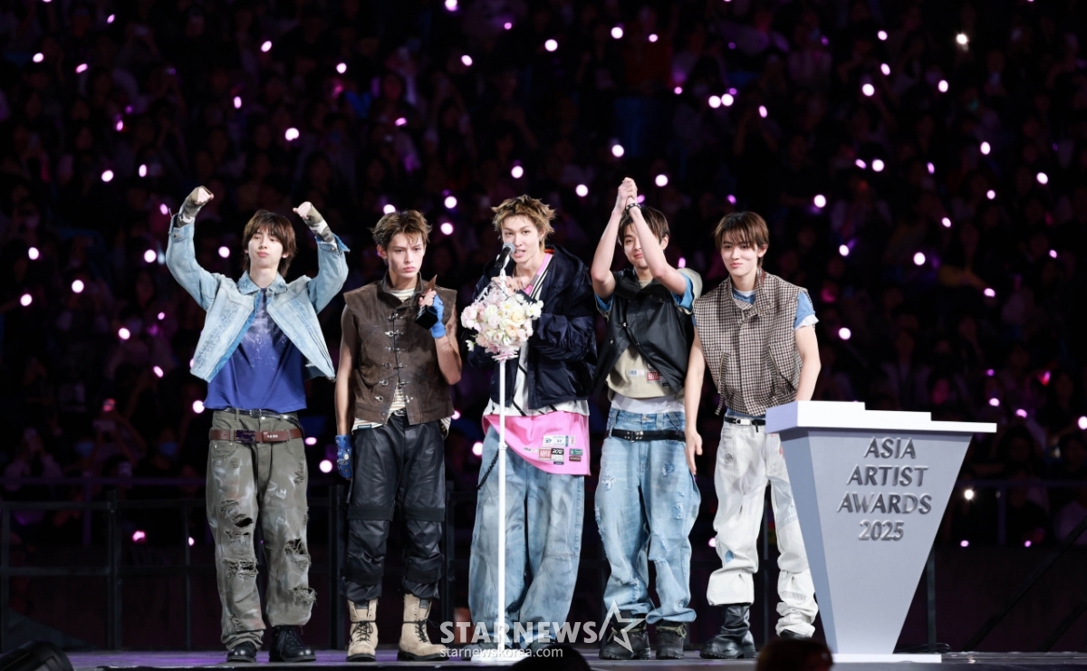그룹 코르티스(CORTIS)가 6일 가오슝 내셔널 스타디움에서 진행된 스타뉴스 주최 '10주년 아시아 아티스트 어워즈 2025(10th Anniversary Asia Artist Awards 2025, '10주년 AAA 2025')에서 AAA Rookie of the Year상을 받고 수상소감을 말하고 있다.