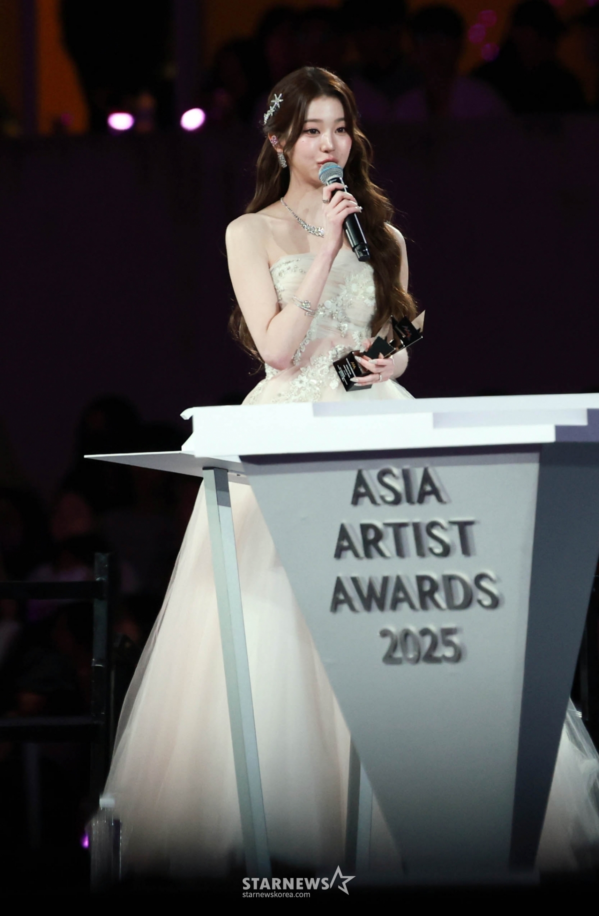 그룹 아이브(IVE) 장원영이 6일 가오슝 내셔널 스타디움에서 진행된 스타뉴스 주최 '10주년 아시아 아티스트 어워즈 2025(10th Anniversary Asia Artist Awards 2025, '10주년 AAA 2025')에서 Symbol of AAA상을 받고 수상소감을 말하고 있다.