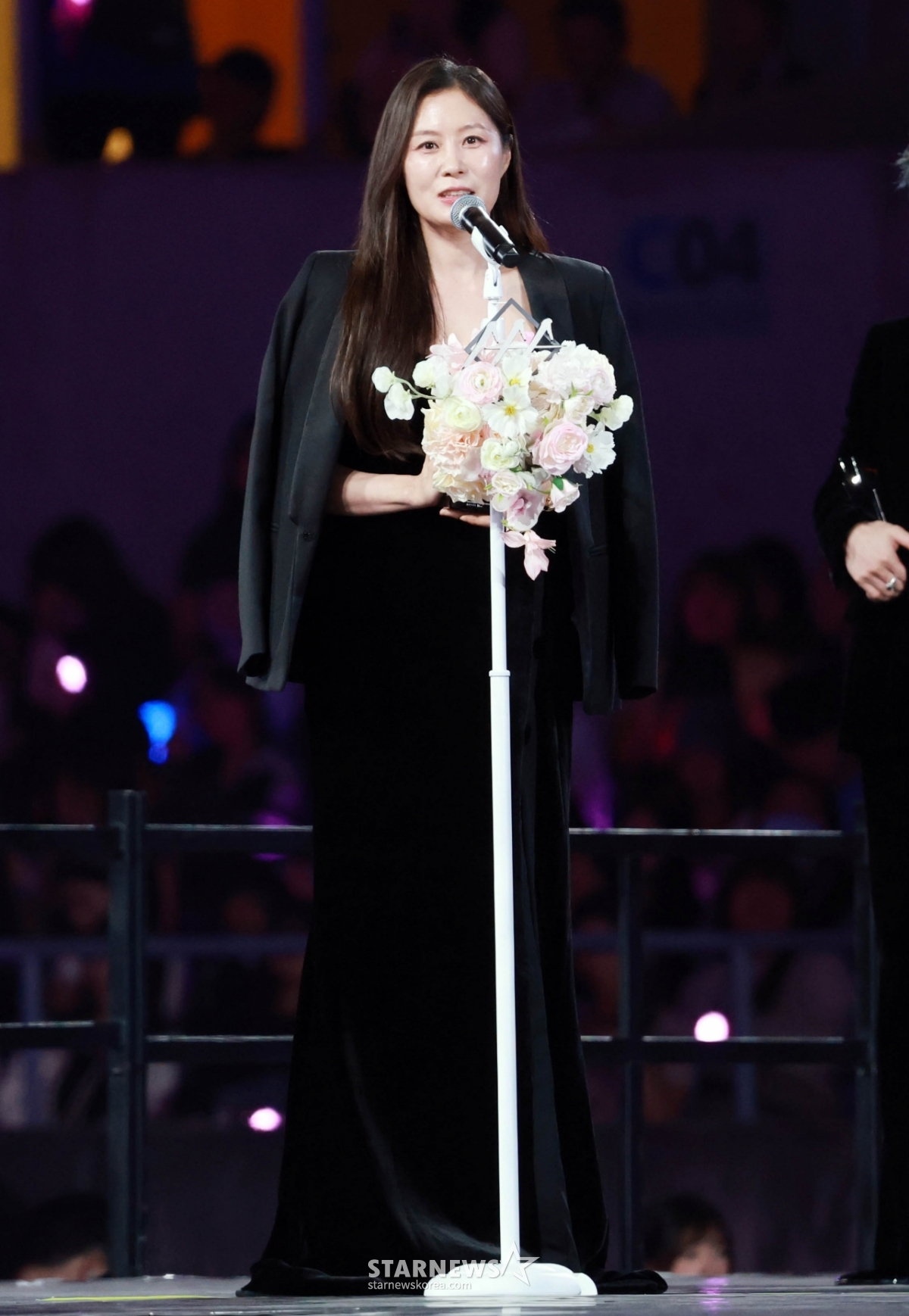 배우 문소리가 6일 가오슝 내셔널 스타디움에서 진행된 스타뉴스 주최 '10주년 아시아 아티스트 어워즈 2025(10th Anniversary Asia Artist Awards 2025, '10주년 AAA 2025')에서 AAA Best Artist상을 받고 수상소감을 말하고 있다.