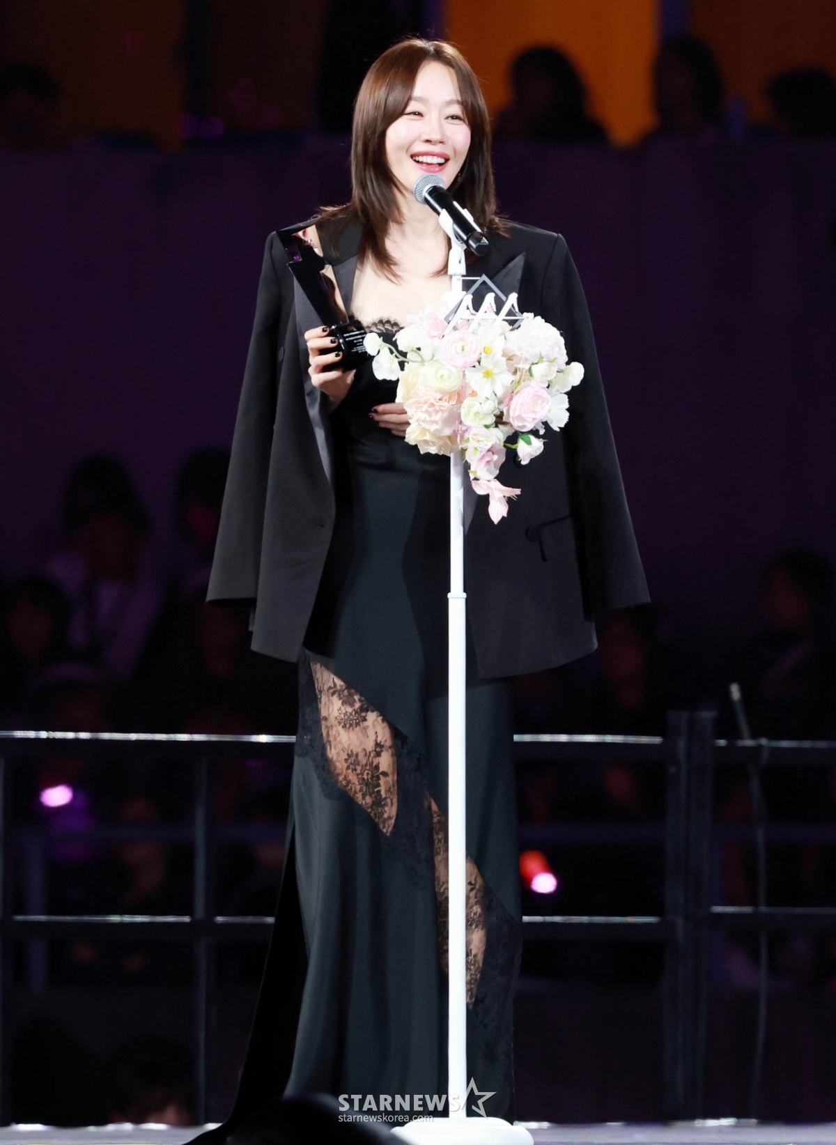 배우 엄지원이 6일 가오슝 내셔널 스타디움에서 진행된 스타뉴스 주최 '10주년 아시아 아티스트 어워즈 2025(10th Anniversary Asia Artist Awards 2025, '10주년 AAA 2025')에서 AAA 10 Legendary Actress상을 받고 수상소감을 말하고 있다.
