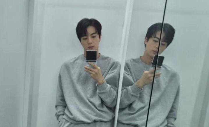 거울 옆에서 살짝 기댄 월드와이드 핸섬 진의 주먹만 한 얼굴, 길고 우아한 목과 넓은 어깨, 양말만 신은 긴 다리의 놀라운 비율과 훤칠한 황금 비율 피지컬 또한 보는 이들의 마음을 설레게 했다. 스케줄 스포일러를 피하려는 듯 사진에서 주변 물건을 지워 삼성 갤럭시 휴대폰의 'AI로 생성한 콘텐츠'라는 마크가 보였다.