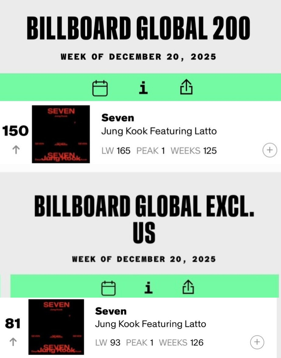 앞서 'Seven'은 빌보드 '글로벌(미국 제외)'에서 9주 연속 1위, '글로벌 200'에서 7주 연속 1위에 올랐고 두 차트에 역대 아시아 가수곡 최초이자 최장 기간인 7주 연속 동시 1위를 달성하는 대기록도 써 내려갔다.
