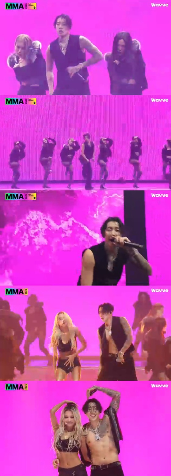 이후 박재범의 '몸매' 무대도 이어졌다. 박재범은 최근 AI를 이용해 트로트 버전으로 편곡해 화제가 됐던 '몸매'를 따라 불렀다.