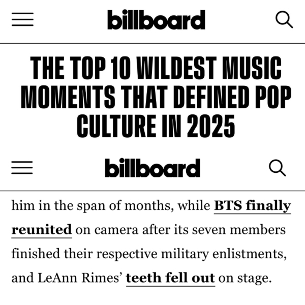 이번 빌보드 리포트에는 BTS 외에도 전 세계를 놀라게 한 소식들이 대거 포함되었다. △테일러 스위프트와 트래비스 켈시의 약혼△비욘세의 'Cowboy Carter' 앨범으로 그래미 '올해의 앨범상' 수상△케이티 페리의 11분간 우주 비행△켄드릭 라마의 슈퍼볼 하프타임 쇼 공연△모건 월렌의 SNL 출연 취소 사건 등이 2025년을 장식한 주요 순간으로 이름을 올렸다.
