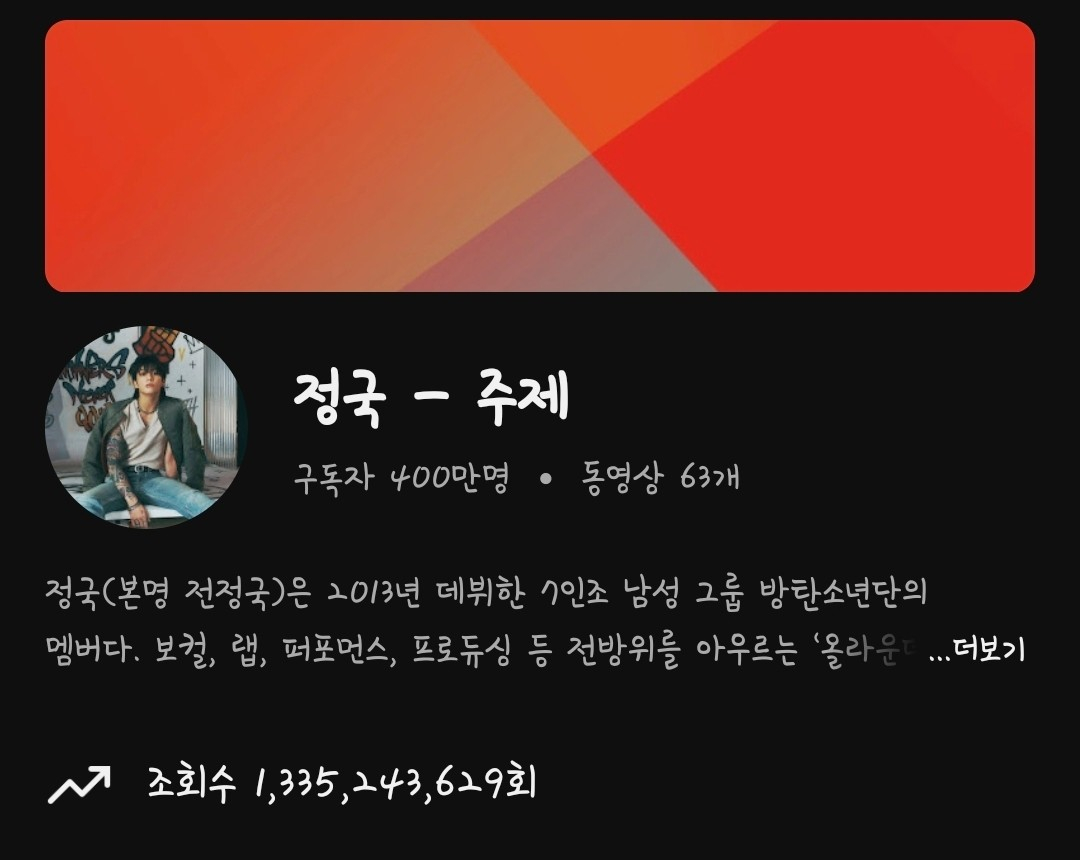 정국의 유튜브 토픽(Topic:주제) 채널은 최근 구독자 수 400만 명을 돌파했다. 정국의 유튜브 토픽 채널은 K-팝 솔로 가수 가운데 최다 구독자 수 1위를 달성하며 독보적인 인기와 영향력을 입증했다.
