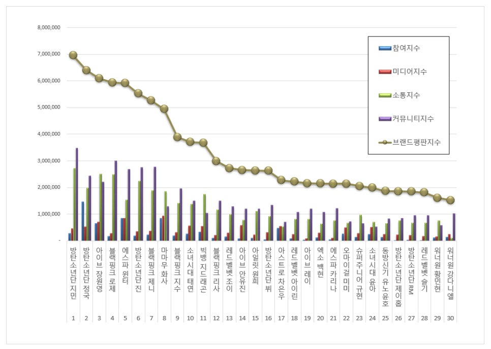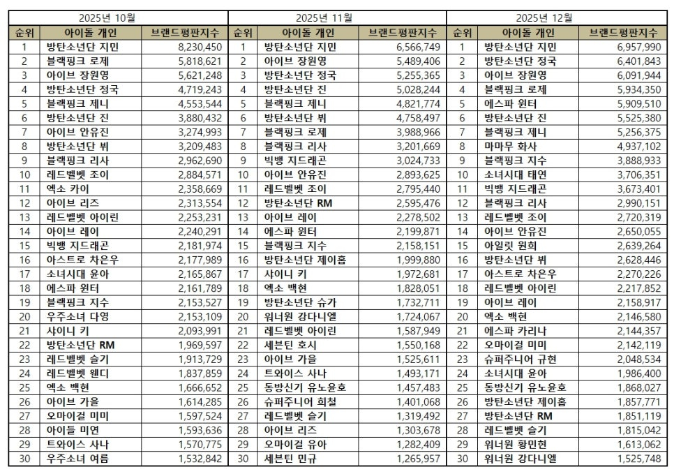 2025년 12월 아이돌 개인 브랜드평판 30위 순위는 방탄소년단 지민, 방탄소년단 정국, 아이브 장원영, 블랙핑크 로제, 에스파 윈터, 방탄소년단 진, 블랙핑크 제니, 마마무 화사, 블랙핑크 지수, 소녀시대 태연, 빅뱅 지드래곤, 블랙핑크 리사, 레드벨벳 조이, 아이브 안유진, 아일릿 원희, 방탄소년단 뷔, 아스트로 차은우, 레드벨벳 아이린, 아이브 레이, 엑소 백현, 에스파 카리나, 오마이걸 미미, 슈퍼주니어 규현, 소녀시대 윤아, 동방신기 유노윤호, 방탄소년단 제이홉, 방탄소년단 RM, 레드벨벳 슬기, 워너원 황민현, 워너원 강다니엘 순으로 분석됐다.