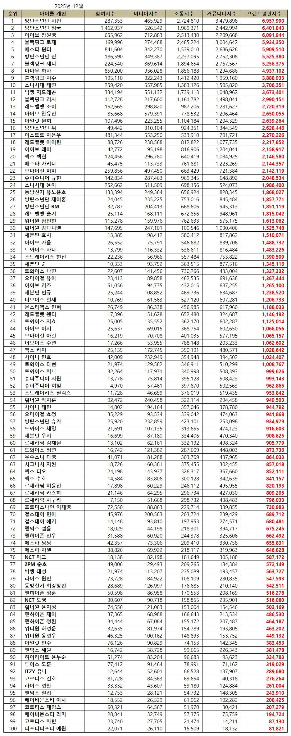 2025년 12월 아이돌 개인 브랜드평판 100위 순위는 방탄소년단 지민, 방탄소년단 정국, 아이브 장원영, 블랙핑크 로제, 에스파 윈터, 방탄소년단 진, 블랙핑크 제니, 마마무 화사, 블랙핑크 지수, 소녀시대 태연, 빅뱅 지드래곤, 블랙핑크 리사, 레드벨벳 조이, 아이브 안유진, 아일릿 원희, 방탄소년단 뷔, 아스트로 차은우, 레드벨벳 아이린, 아이브 레이, 엑소 백현, 에스파 카리나, 오마이걸 미미, 슈퍼주니어 규현, 소녀시대 윤아, 동방신기 유노윤호, 방탄소년단 제이홉, 방탄소년단 RM, 레드벨벳 슬기, 워너원 황민현, 워너원 강다니엘, 세븐틴 호시, 아이브 가을, 트와이스 사나, 스트레이키즈 현진, 세븐틴 준, 트와이스 나연, 오마이걸 유아, 아이브 리즈, 세븐틴 민규, 더보이즈 현재, 몬스타엑스 민혁, 레드벨벳 웬디, 트와이스 지효, 아이브 이서, 오마이걸 아린, 더보이즈 주연, 엑소 카이, 샤이니 민호, 트와이스 다현, 트와이스 미나, 슈퍼주니어 시원, 슈퍼주니어 희철, 스트레이키즈 필릭스, 워너원 박지훈, 샤이니 태민, 오마이걸 효정, 방탄소년단 슈가, 트와이스 채영, 세븐틴 우지, 르세라핌 김채원, 트와이스 정연, 우주소녀 다영, 시그니처 지원, 엑소 디오, 엑소 수호, 르세라핌 허윤진, 르세라핌 카즈하, 르세라핌 사쿠라, 프로미스나인 이채영, 걸스데이 민아, 걸스데이 혜리, 엔믹스 설윤, 엔하이픈 선우, 에스파 닝닝, 에스파 지젤, NCT 마크, 2PM 준호, 빅뱅 대성, 라이즈 원빈, 동방신기 최강창민, 엔하이픈 성훈, NCT 도영, 워너원 윤지성, 엔하이픈 제이, 엔하이픈 정원, 워너원 하성운, 워너원 옹성우, 아일릿 민주, 엔믹스 해원, 하이라이트 윤두준, 투어스 도훈, ITZY 유나, 코르티스 건호, 라이즈 성찬, 엔믹스 릴리, 베이비몬스터 아사, 코르티스 제임스, 베이비몬스터 라미, 코르티스 마틴, 피프티피프티 예원 순으로 분석됐다.