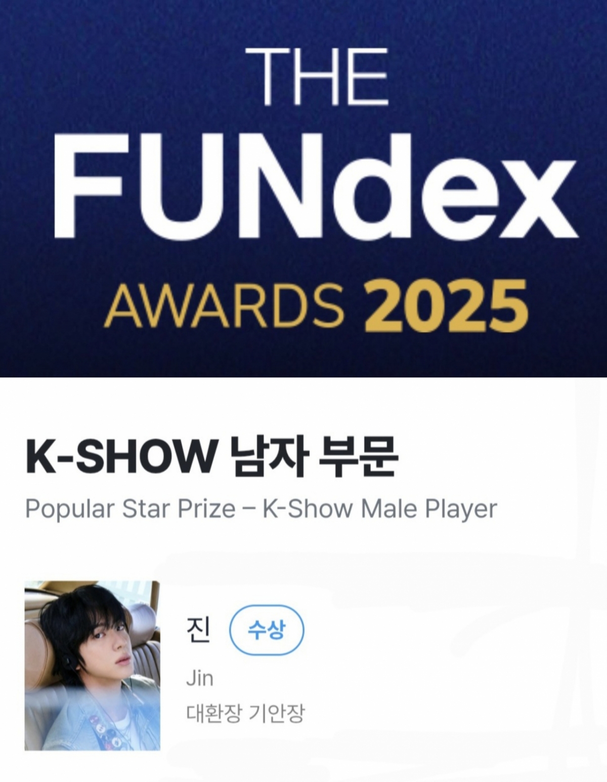진은 지난 18일 개최된 '2025 펀덱스 어워드'에서 글로벌 네티즌 인기 스타상 K-SHOW남자 부문의 첫 수상자로 선정되는 영광을 안았다.