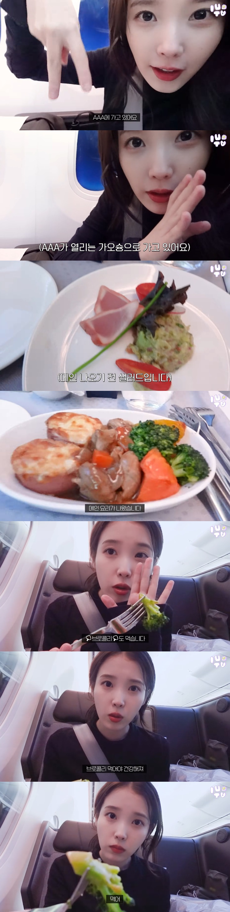 아이유는 속삭이는 목소리로 "몰래 촬영을 해야 하는 건 아닌데 앞뒤로 선배님들과 아는 분들이 계셔서 조용히 말하게 된다"라고 말했다. 아이유는 기내식을 먹으며 "나는 어른이기 때문에 브로콜리를 먹겠다"라면서 자신이 출연한 넷플릭스 '폭싹 속았수다'의 상황극을 펼쳤다.