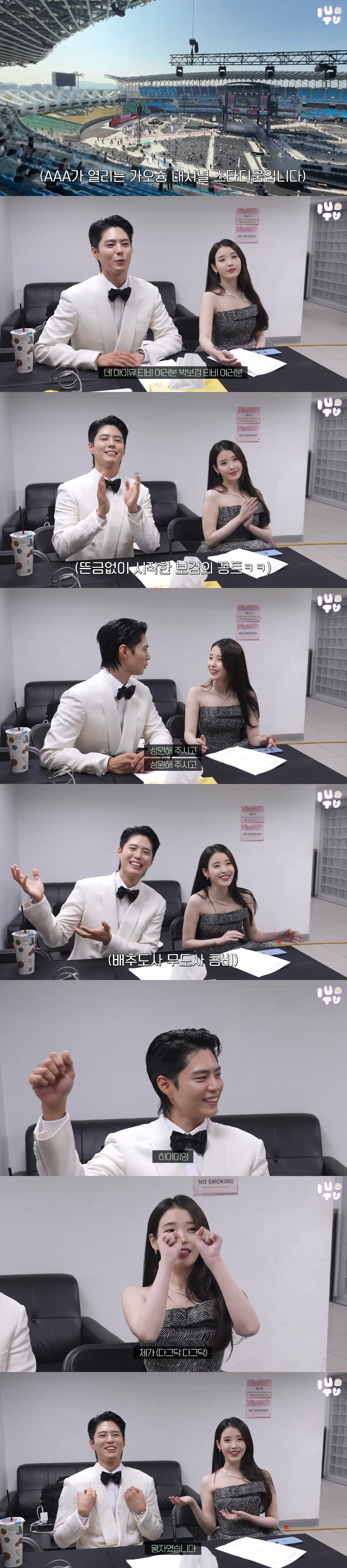 아이유는 이후 '10주년 AAA 2025' 대기실에서 박보검과 만나 MC 상황극도 펼쳤다. 박보검과 '배추도사 무도사' 케미스트리를 언급한 아이유는 자신의 의상 콘셉트를 "얼룩말"이라고 밝혔고, 박보검이 "저는 백마 탄 왕자"라고 하자 아이유는 "말과 왕자님은 뗄 수 없는 조합이다. 이따가 버기카가 아니라 저를 타고 가야하는 거 아니냐"라고 장난쳤다.