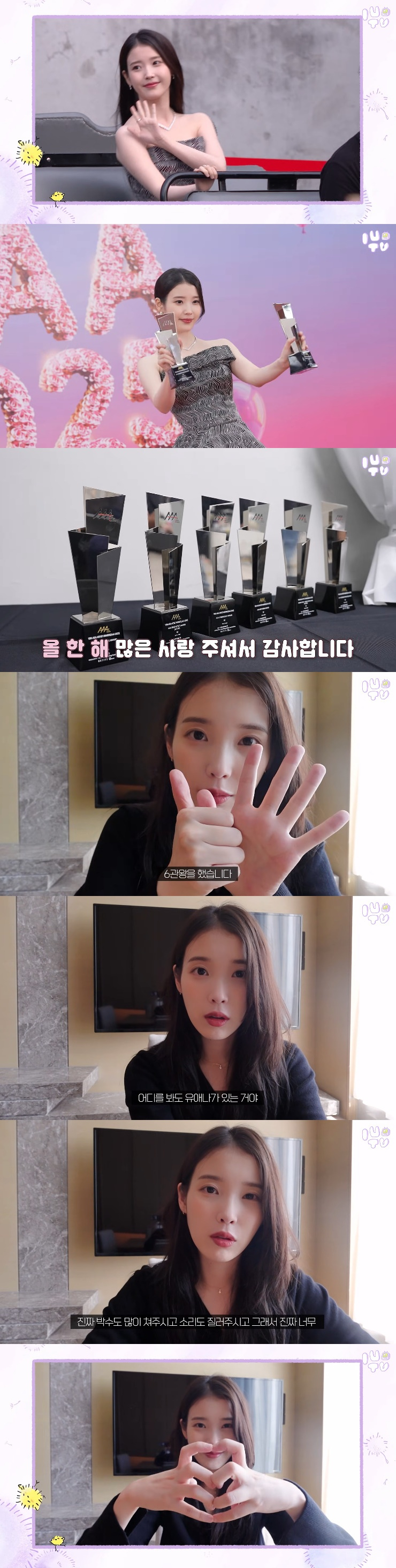 아이유는 '10주년 AAA 2025'에서 대상인 '올해의 배우'를 포함해 'AAA 10 레전더리 여자 솔로', '베스트 아티스트', '패뷸러스', '핫트랜드', '베스트 커플' 트로피를 들어올리며 6관왕의 영예를 안았다.