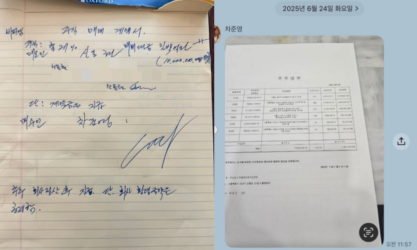 MC몽은 "6월 30일 회사를 가로채려는 차가원 작은 아버지에게 제가 조작해서 보내 문자입니다"라며 "첫번째는 차가원 삼촌이 저애게 2대 주주를 유지 시켜줄테니 함께 뺏어보자며 보낸 가짜 서류 이며 저에게 지분을 넘기자고 한 주주명부와 주식양도 매매 계약서, 자필 계약서 입니다"라고 주장했다.