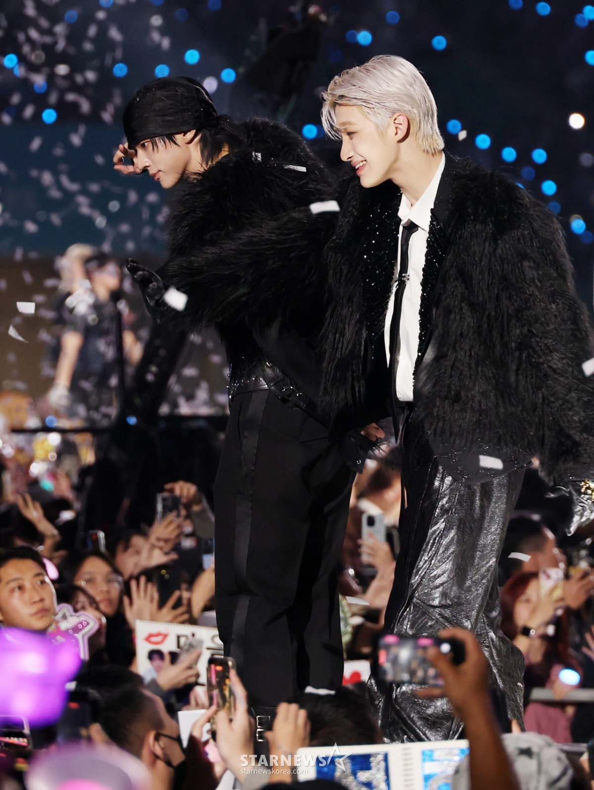 그룹 투어스 도훈, 지훈이 지난 6일 가오슝 내셔널 스타디움에서 진행된 스타뉴스 주최 '10주년 아시아 아티스트 어워즈 2025(10th Anniversary Asia Artist Awards 2025, '10주년 AAA 2025')에서 팬들에게 인사를 하고 있다.