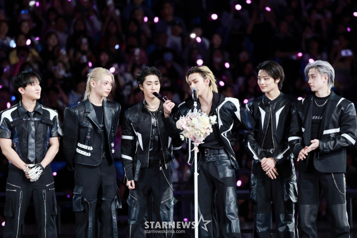 그룹 스트레이키즈(Stray Kids)가 6일 가오슝 내셔널 스타디움에서 진행된 스타뉴스 주최 '10주년 아시아 아티스트 어워즈 2025(10th Anniversary Asia Artist Awards 2025, '10주년 AAA 2025')에서 AAA Best Artist상을 받고 수상소감을 말하고 있다. /2025.12.06 /사진=임성균 tjdrbs23@