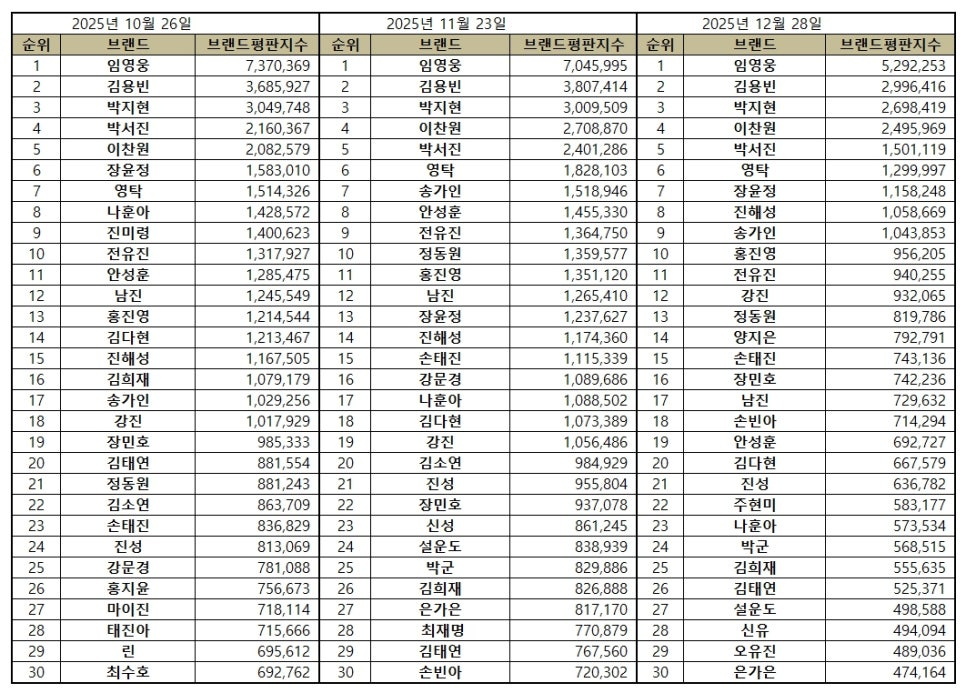 2025년 12월 트로트 가수 브랜드평판 30위 순위는 임영웅, 김용빈, 박지현, 이찬원, 박서진, 영탁, 장윤정, 진해성, 송가인, 홍진영, 전유진, 강진, 정동원, 양지은, 손태진, 장민호, 남진, 손빈아, 안성훈, 김다현, 진성, 주현미, 나훈아, 박군, 김희재, 김태연, 설운도, 신유, 오유진, 은가은 순으로 분석됐다.