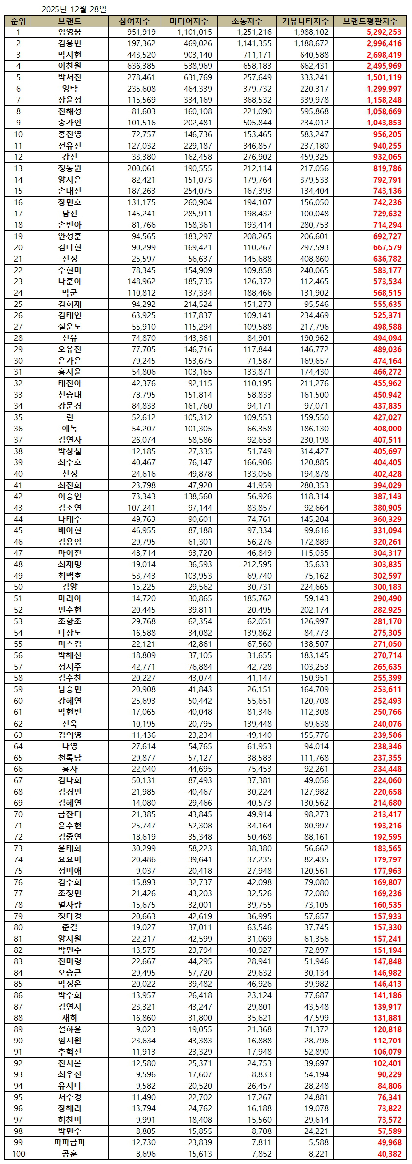 임영웅은 12월 28일 한국기업평판연구소가 발표한 트로트 가수 브랜드평판 2025년 12월 빅데이터 분석결과, 1위를 차지했다. 임영웅은 이로써 60개월 연속 1위에 오르며 막강 존재감을 보여줬다. 1위 임영웅에 이어 2위 김용빈, 3위 박지현 순이었다.