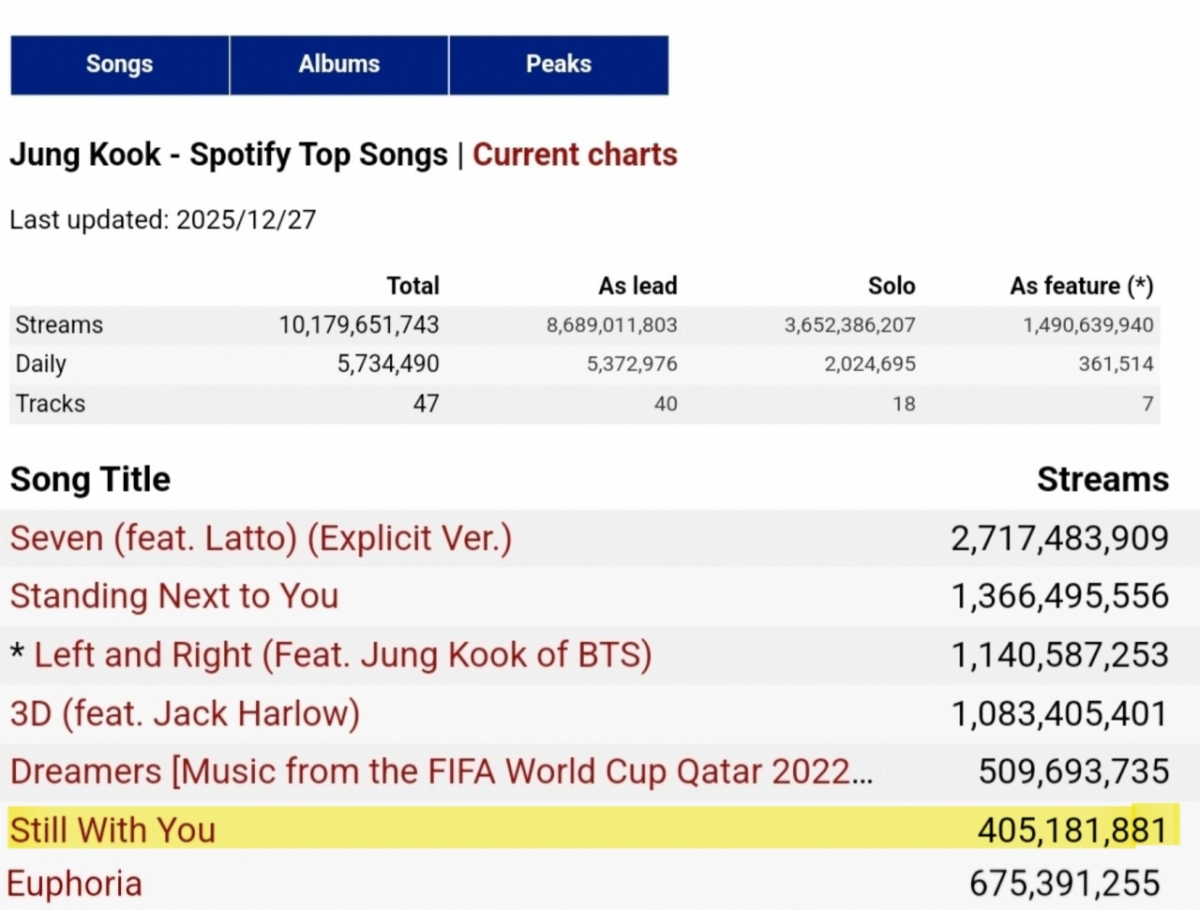 2020년 발매된 정국의 'Still With You'는 한국어 팬송임에도 하루 50만 건에 달하는 스트리밍을 꾸준히 기록하며 총 4억 회를 넘겼다.
