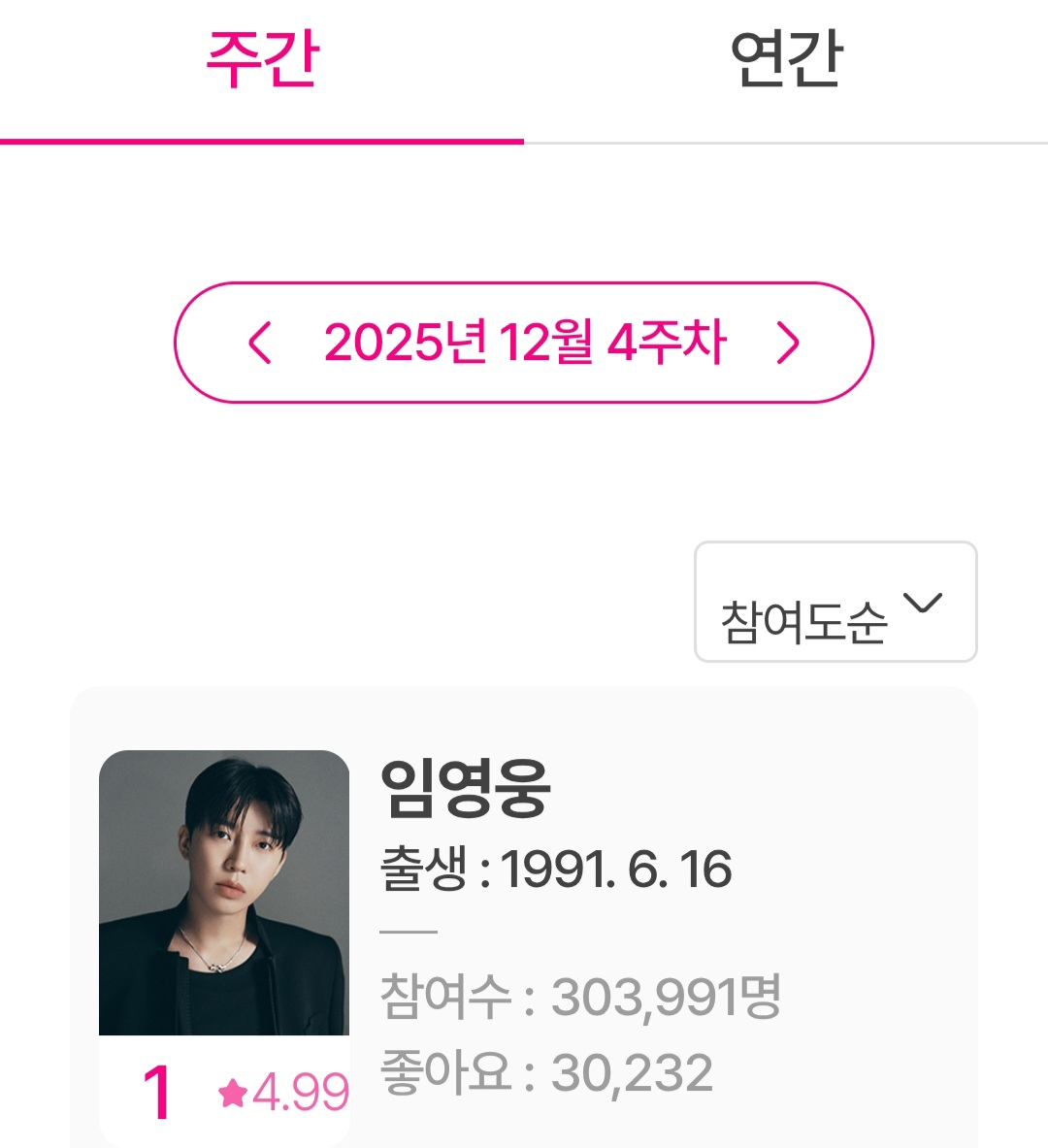 임영웅은 12월 22일부터 12월 28일까지 집계된 12월 4주차 아이돌차트 평점랭킹에서 30만 3991표를 얻어 1위를 기록했다.