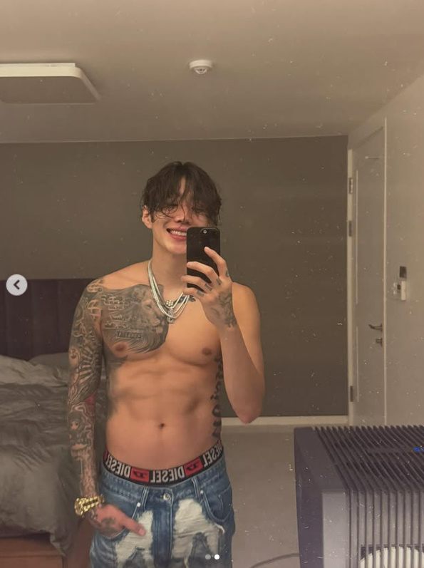 또 다른 사진에서는 섹시 아이콘답게 반전 매력을 과시했다. 상의를 탈의한 채 거울 셀카를 찍고 있는 박재범은 탄탄한 초콜릿 복근과 화려한 타투를 드러내며 독보적인 남성미를 발산했다. 안경을 벗고 젖은 듯한 헤어스타일을 연출한 그는 퇴폐미까지 더했다.