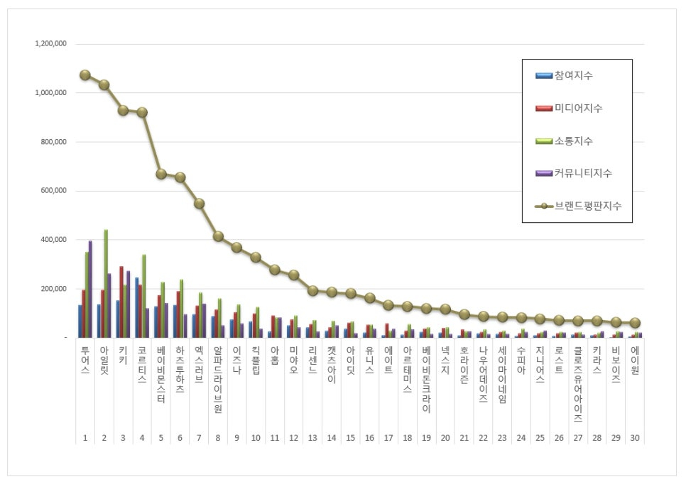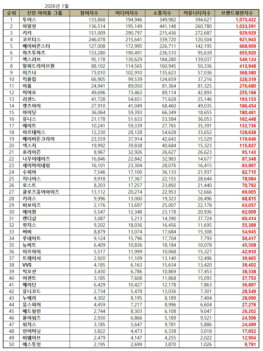 2026년 1월 신인 아이돌그룹 브랜드평판 30위 순위는 투어스, 아일릿 , 키키, 코르티스, 베이비몬스터, 하츠투하츠, 엑스러브, 알파드라이브원, 이즈나, 킥플립, 아홉, 미야오, 리센느, 캣츠아이, 아이딧, 유니스, 에이트, 아르테미스, 베이비돈크라이, 넥스지, 호라이즌, 나우어데이즈, 세이마이네임, 수피아, 지니어스, 로스트, 클로즈유어아이즈, 키라스, 비보이즈, 에이원 순으로 분석됐다.