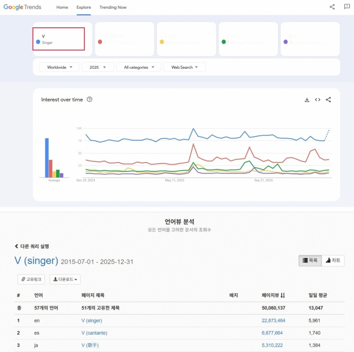 구글 트렌드(Google Trends)에 따르면 뷔는 2025년 최다 검색량을 기록한 K팝 스타에 등극했다. 뷔는 구글 트렌드가 집계되는 81개국의 나라에서 미국을 비롯한 77개국에서 최다 검색 1위를 기록하고 있다.