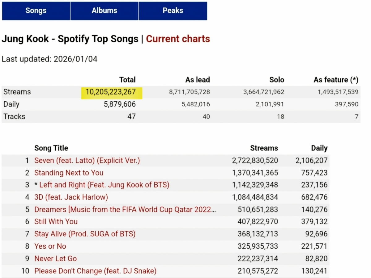 방탄소년단(BTS) 정국이 세계 최대 음원 스트리밍 플랫폼 스포티파이에서 누적 102억 스트리밍을 돌파했다. 스포티파이 개인 계정의 모든 크레딧을 합산한 기록으로, 초강력 음원 제왕의 입지를 다시 입증했다.