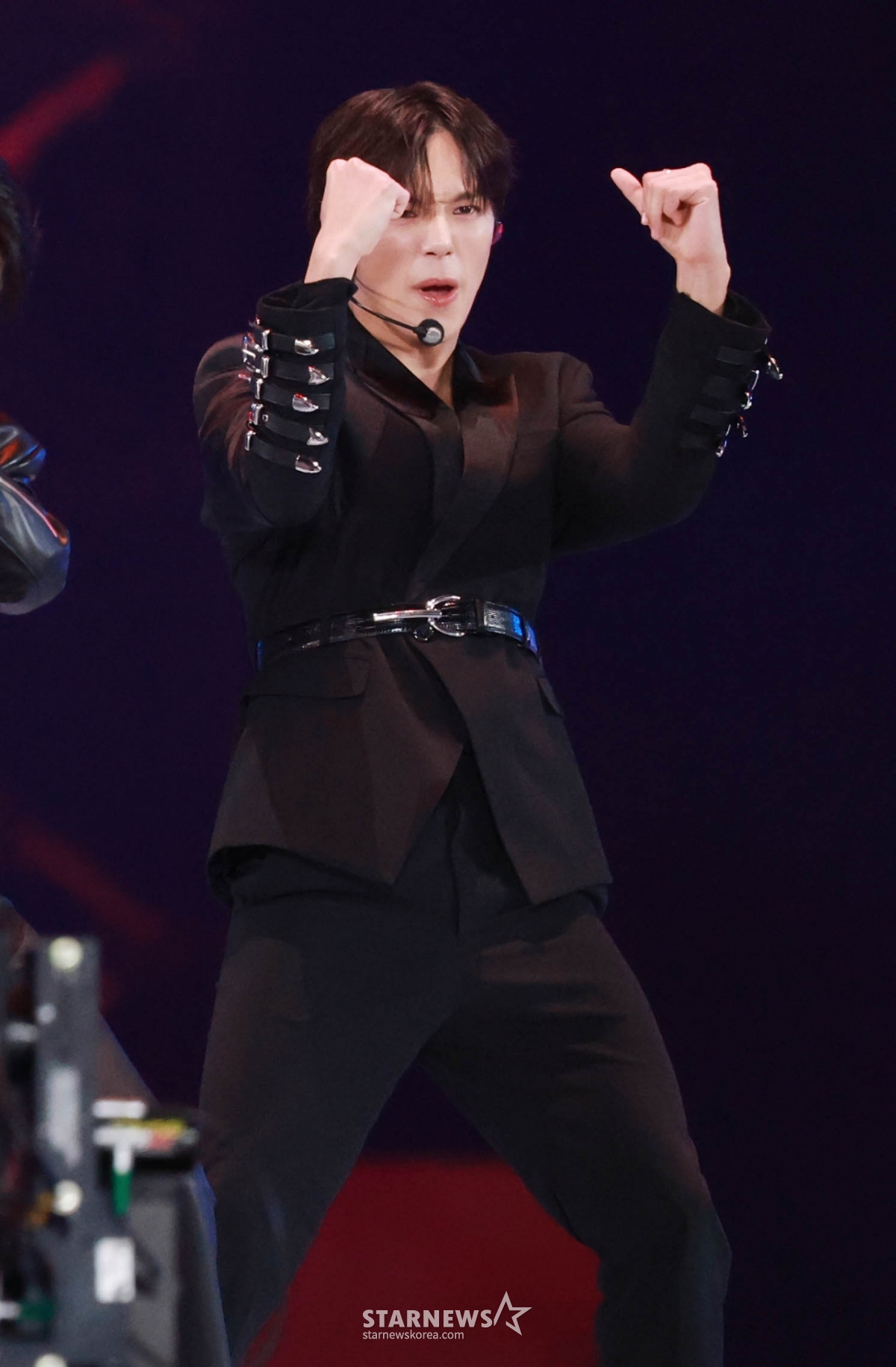 그룹 몬스타엑스(MONSTA X) 민혁이 6일 가오슝 내셔널 스타디움에서 진행된 스타뉴스 주최 '10주년 아시아 아티스트 어워즈 2025(10th Anniversary Asia Artist Awards 2025, '10주년 AAA 2025')에서 멋진 무대를 선고이고 있다.