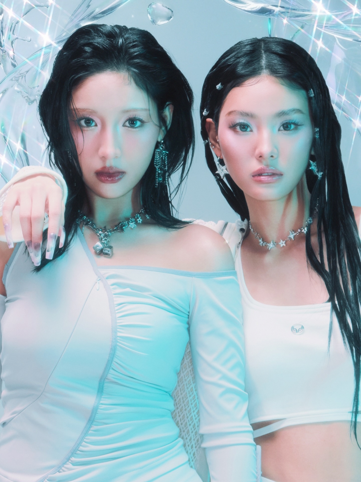 상아, 초원은 세련된 분위기의 주얼리 스타일링으로 강렬한 존재감을 드러냈다. 두 사람은 탱크톱에 Y2K 감성의 워싱 데님 팬츠를 조합했고, 반짝이는 별 모양의 초신성 목걸이와 귀걸이 그리고 큐브 주사위 목걸이를 통해 매력을 더했다. 또한 거친 레더 소재의 의상과 함께 반항적인 눈빛으로 강렬한 비주얼을 완성했다.