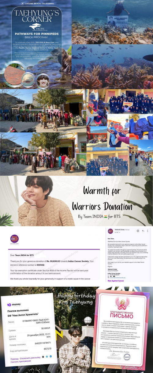 인도 팬베이스 'Team INDIA'는 경제적 사정으로 치료받지 못하는 소아암 환우를 위해 ICS에 기부금을 전달했다. 튀르키예 팬베이스 'Vante Blogs'는 유니세프의 긴급 구호 아동 기금에 기부했다.