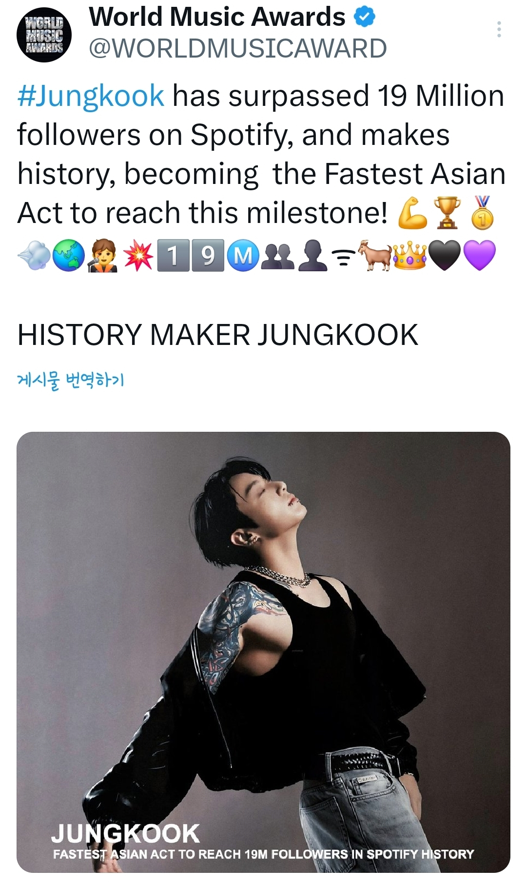 '월드뮤직어워드'(WMA) 공식 계정에 따르면, 정국은 세계 최대 음원 스트리밍 플랫폼 '스포티파이'(Spotify)에서 개인 계정 팔로워 수 1900만 명을 달성했다.