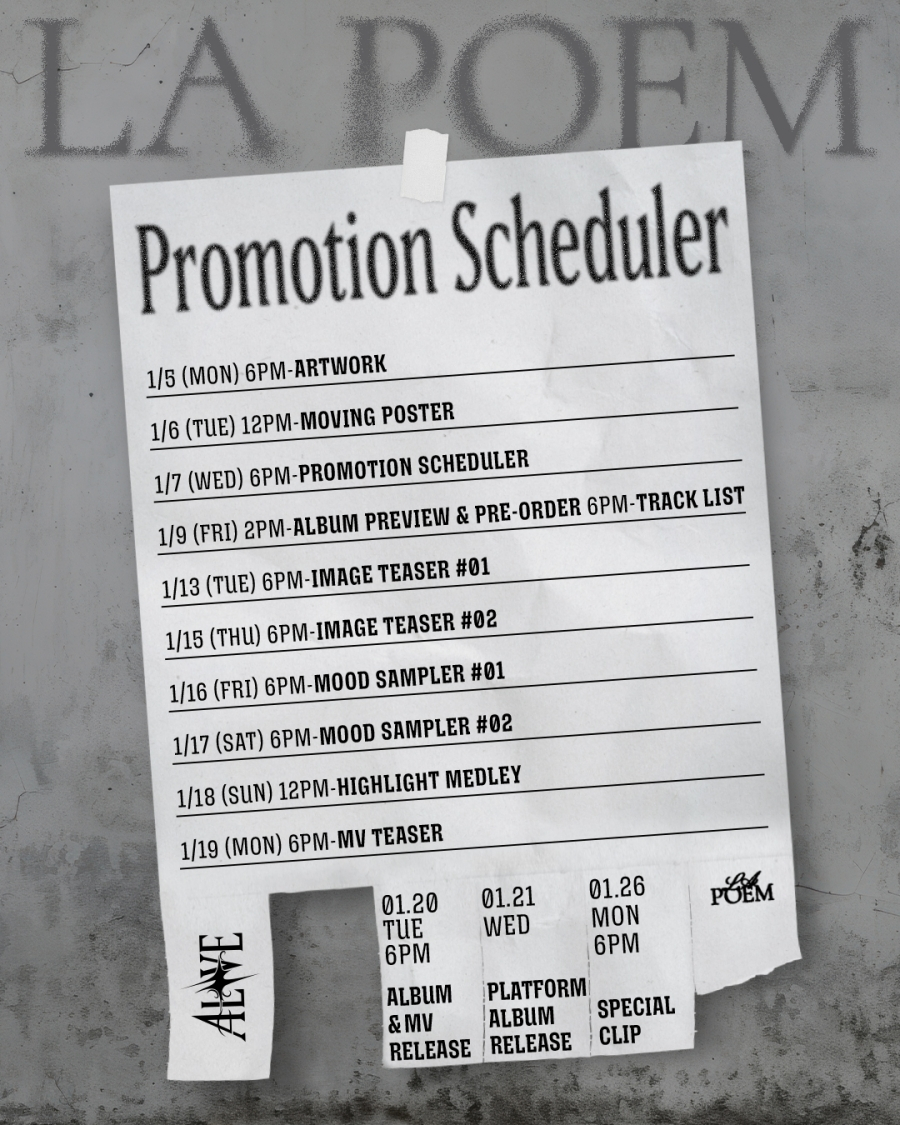 소속사 드라마하우스스튜디오는 지난 7일 오후 6시 공식 SNS를 통해 라포엠의 세 번째 미니 앨범 '얼라이브(ALIVE)' 프로모션 스케줄러를 업로드했다.