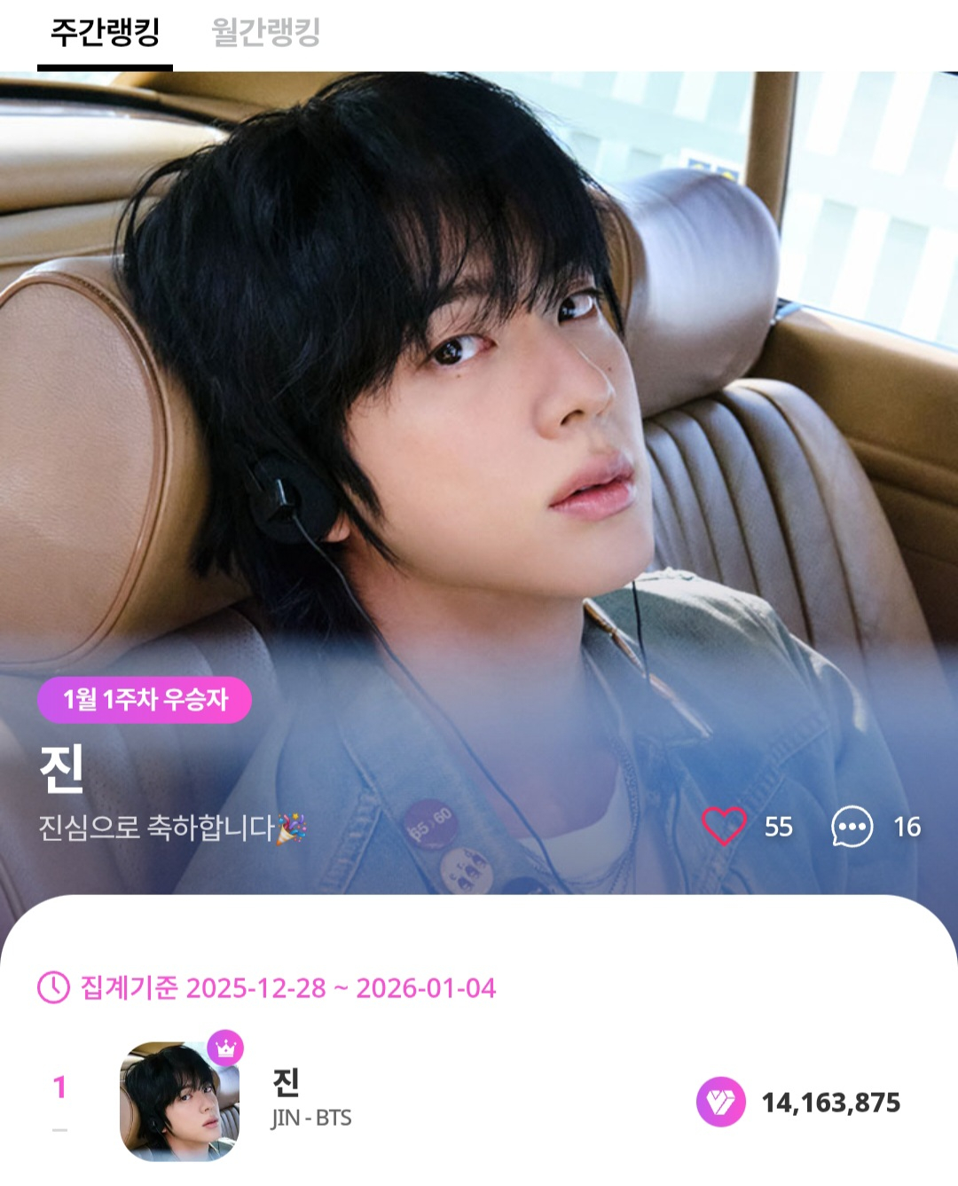 진은 2025년 12월 28일부터 2026년 1월 4일까지 집계된 1월 1주차 K-POP 개인 부문 주간랭킹 투표에서 1416만 3875표를 얻어 정상에 올랐다. 이로써 해당 부문에서 97주 연속 1위를 달성했다.