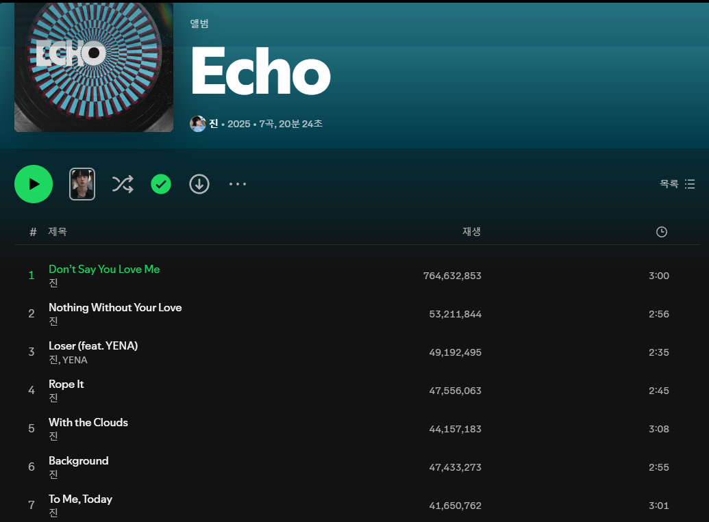 진의 솔로 앨범 'Echo'의 타이틀곡 'Don't Say You Love Me'는 최근 세계 최대 음원 플랫폼 스포티파이(Spotify)에서 7억 6463만 스트리밍을 기록하며 주목받았다. 이 곡은 공개 이후 꾸준히 재생 수가 증가하면서 장기 흥행 곡으로 자리 잡았다. 감성적인 멜로디와 절제된 보컬, 이별의 여운을 담은 서정적인 메시지가 전 세계 리스너들의 공감을 얻고 있다. 발매 이후에도 안정적으로 스트리밍이 늘어나며, 진의 음악이 단기적인 화제성을 넘어 지속적인 청취력을 갖췄음을 보여주고 있다.