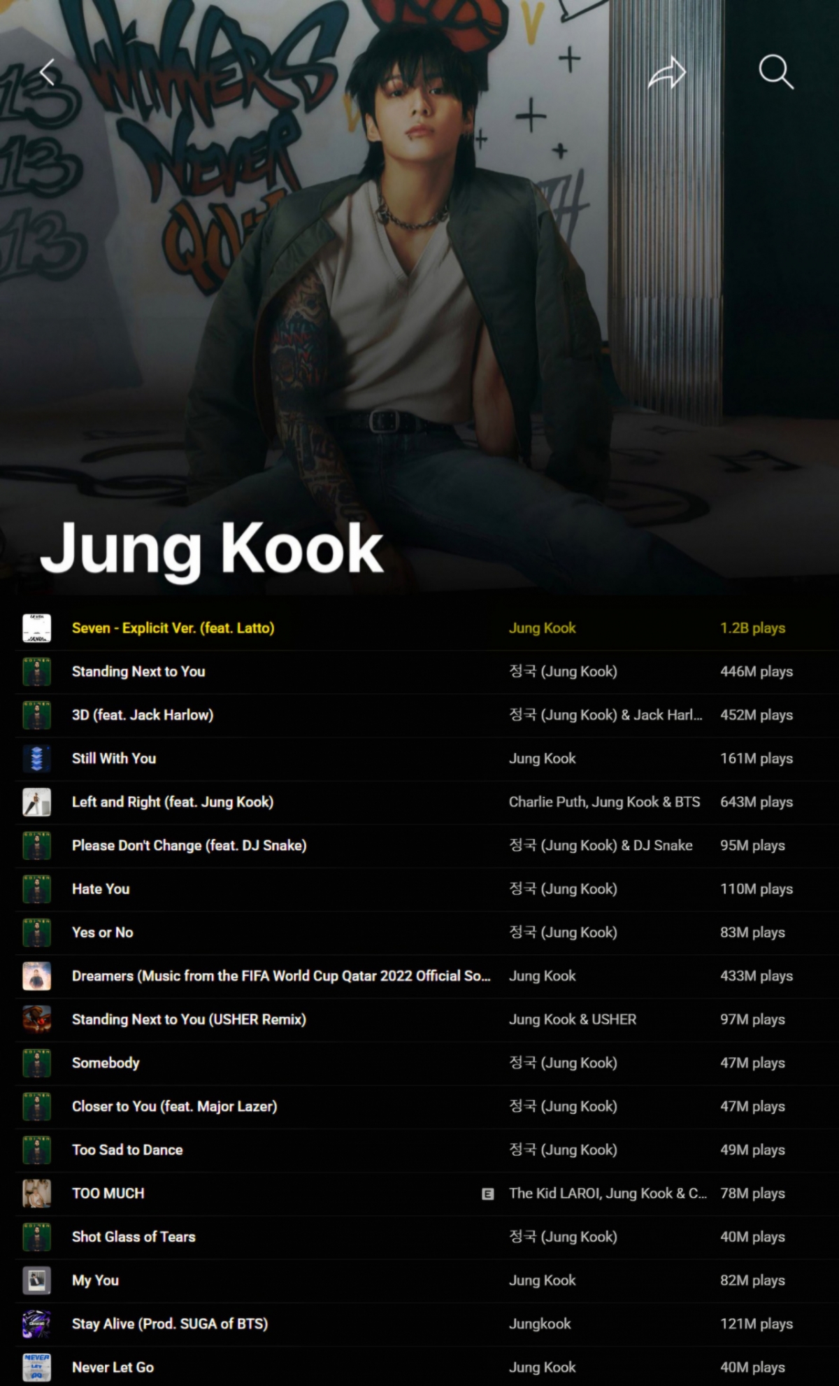 정국이 2023년 발표한 솔로 데뷔곡 'Seven'이 유튜브 뮤직에서 12억 스트리밍을 돌파했다. 발매 2년 6개월이 지났음에도 유튜브 뮤직에서 꾸준한 인기를 얻으며 글로벌 메가 히트송임을 다시 입증했다.