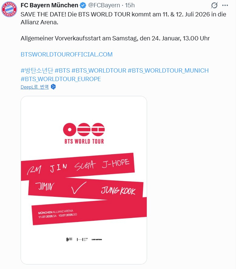독일에서는 콘서트 장소 알리안츠 아레나 연고지인 독일 분데스리가 명문 FC 바이에른 뮌헨이 공식 계정을 통해 "날짜를 저장하라! BTS 월드투어가 2026년 7월 11~12일 알리안츠 아레나에 온다"며 22만 1천 리트윗을 기록했다.