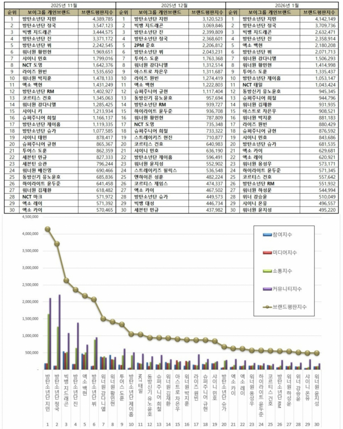1위에 오른 방탄소년단 지민 브랜드는 참여지수 191,119 미디어지수 193,580 소통지수 1,644,486 커뮤니티지수 2,112,964가 되면서 브랜드평판지수 4,142,149로 분석됐으며 지난 12월 브랜드평판지수 3,120,523과 비교해보면 32.74% 상승했다.