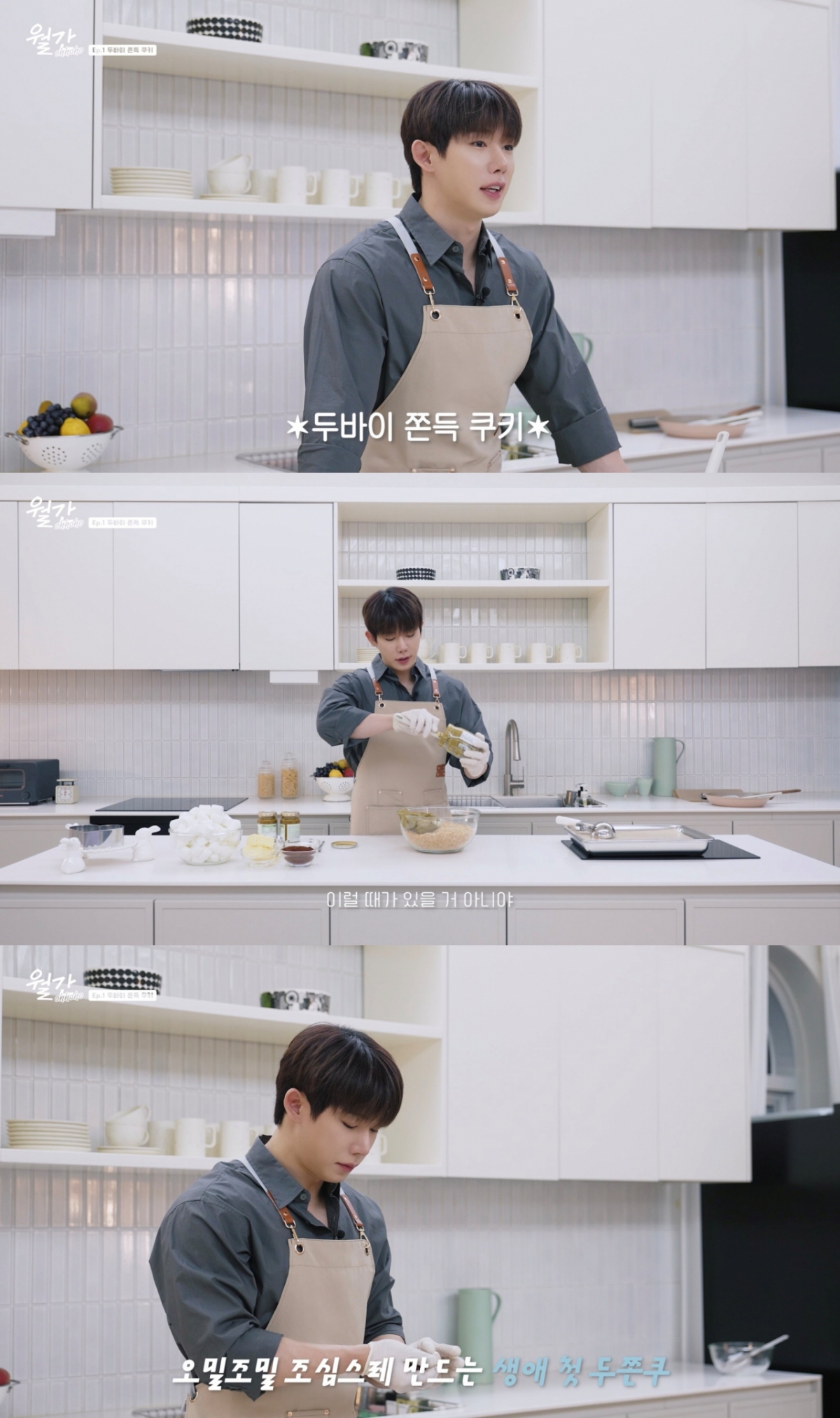 가수 원호(WONHO)가 화제의 디저트 '두바이 쫀득 쿠키' 만들기에 도전했다.