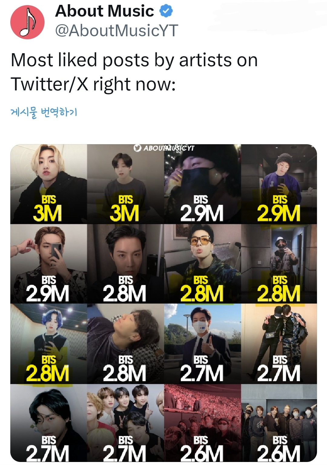 전 세계 음악 전문 소식을 전하는 '어바웃 뮤직'(About Music) 공식 계정은 최근 소셜미디어 'X'(엑스, 구 트위터)에서 가장 많은 좋아요를 얻은 아티스트 게시물을 집중 조명해 전했다.
