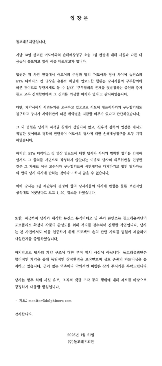영상제작사 돌고래유괴단이 그룹 뉴진스 소속사 어도어와의 손해배상청구 소송 1심 판결에 대한 입장을 밝혔다.